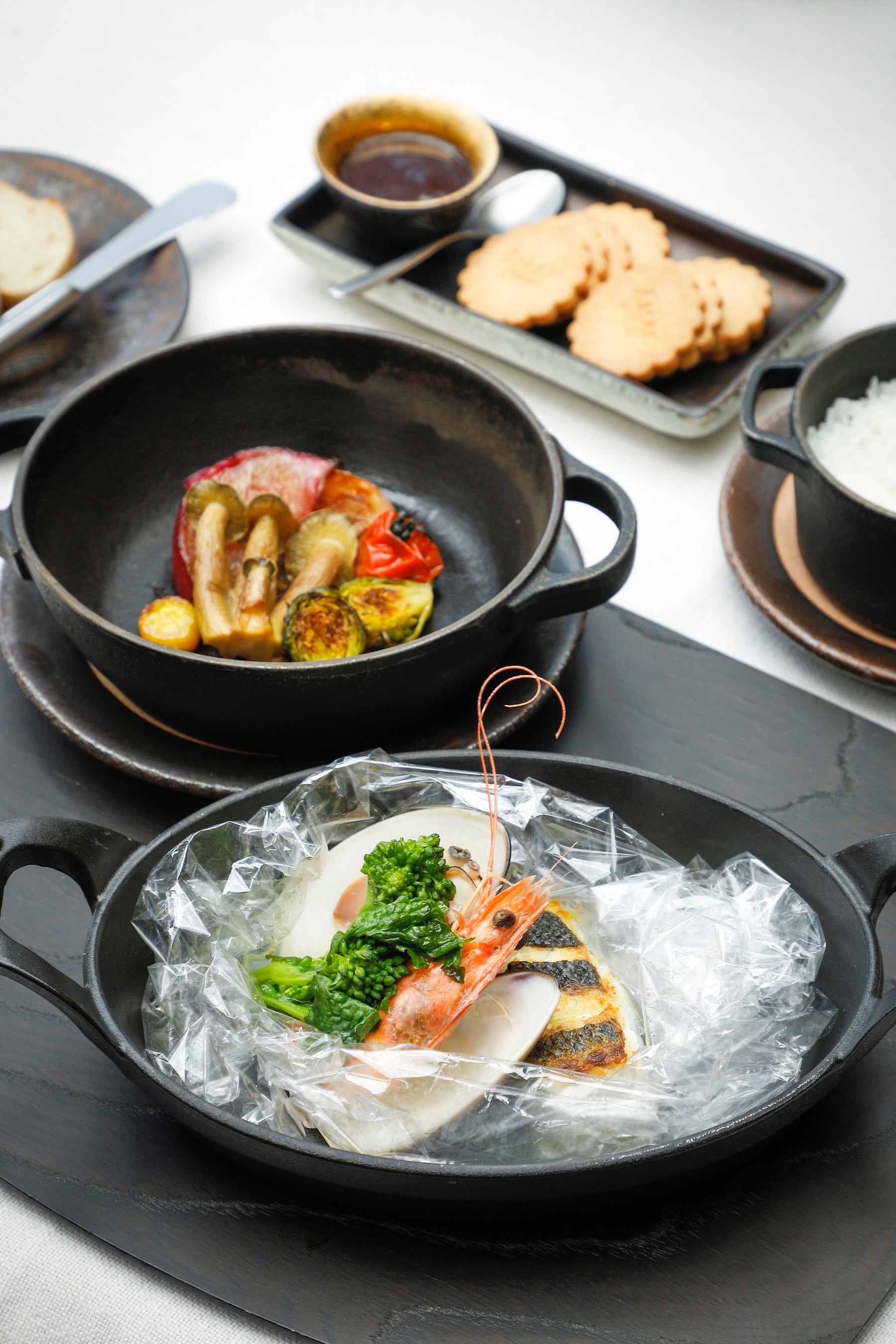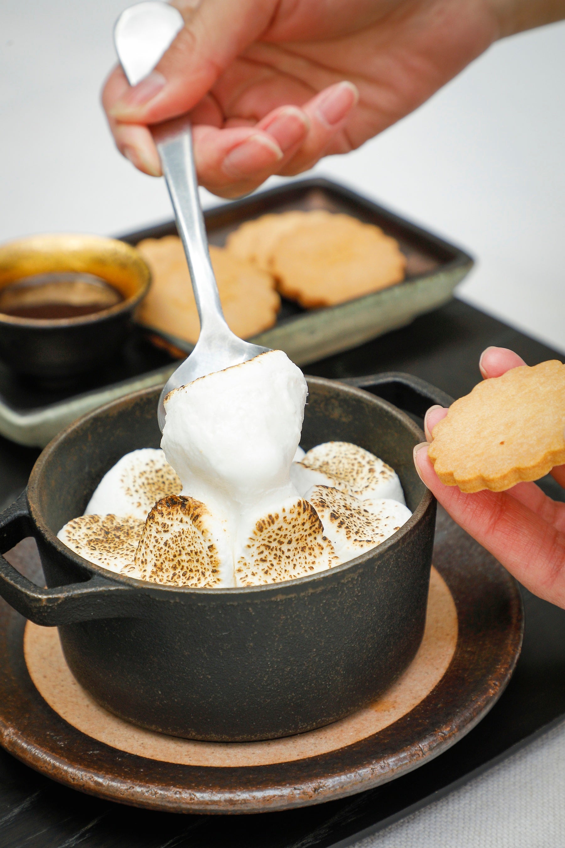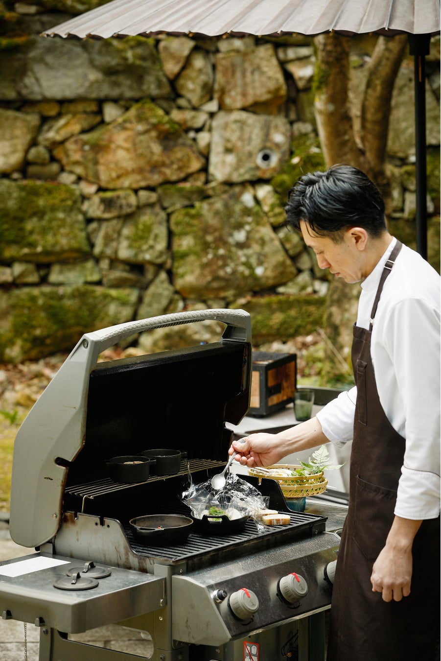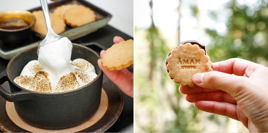 ザ・リビングパビリオン by アマンにご到着後、普段はご宿泊のお客さましかアクセスできないエリアのプライベートガーデンへとご案内します。心地よい木漏れ日のなかにしつらえられたテーブルの横にグリルを設置し、専属のシェフが順にお料理をご用意。テーブルに置かれた七輪に鮎をセットし、ご自身で焼き色を見ながら串をクルクルと回せば、まるでキャンプに来たかのような気分に。デザートにはアウトドアスイーツでお馴染みのスモアをご用意いたします。七輪で焼いたアツアツとろとろのマシュマロをクッキーにはさみ、チョコレートソースをかけてお召し上がりください。青もみじがきらめく森の庭で、自然と一体となるような食エクスペリエンスをご堪能ください。