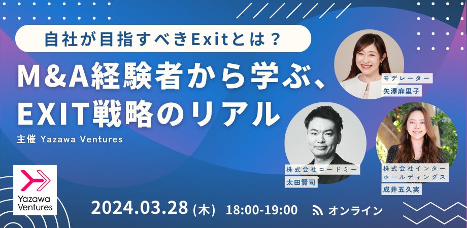 シード 特化のベンチャーキャピタルであるYazawa Ventures(本社:東京都渋谷区 代表取締役:矢澤 麻里子 以下:当社)は、オンラインにてスタートアップ起業家向けに自社の出口戦略を考える機会創出として「自社が目指すべきExitとは?M&A経験者から学ぶ、EXIT戦略のリアル」を開催することをお知らせいたします。