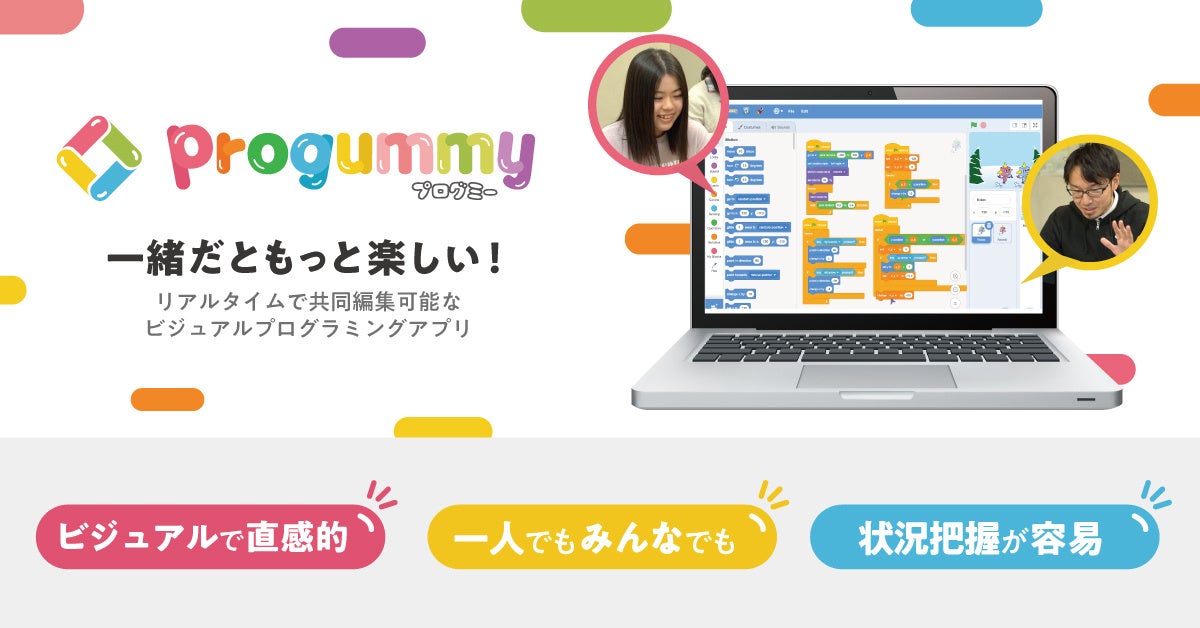 プログミーは、複数人で同時に編集できる共同編集機能を業界で初めて[*1]搭載した、ビジュアルプログラミングアプリです。複数人でリアルタイムにプログラミングを行えるだけでなく、完成したプログラムやゲームを皆でオンラインマルチプレイで遊ぶこともできます。画面上でブロックを組み合わせるようにしてプログラミングを行うため、特定の言語に縛られず、プログラミングの基本となる考え方を楽しく学べます。
