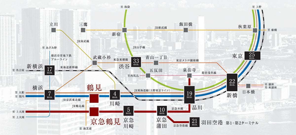 徒歩2分の京急本線「京急鶴見」駅と、徒歩5分のJR京浜東北線・JR鶴見線「鶴見」駅、から都心や横浜等のビックターミナルをはじめ、世界の玄関口となる羽田空港へも快適にアクセスできるポジション。新横浜や川崎など、近隣の繁華街からタクシーが利用しやすい立地である事も魅力的です。
