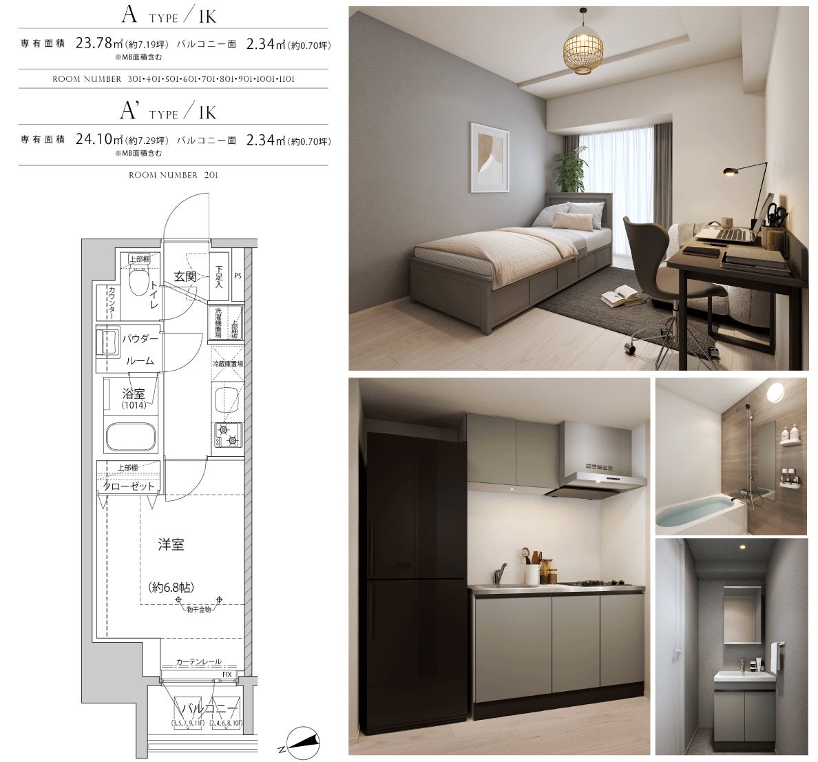 間取りは1K(23.69㎡~24.65㎡)で構成しております。内装は優しい色合いのアクセントクロスグレーの壁紙と、木目調フロアが調和したデザインです。