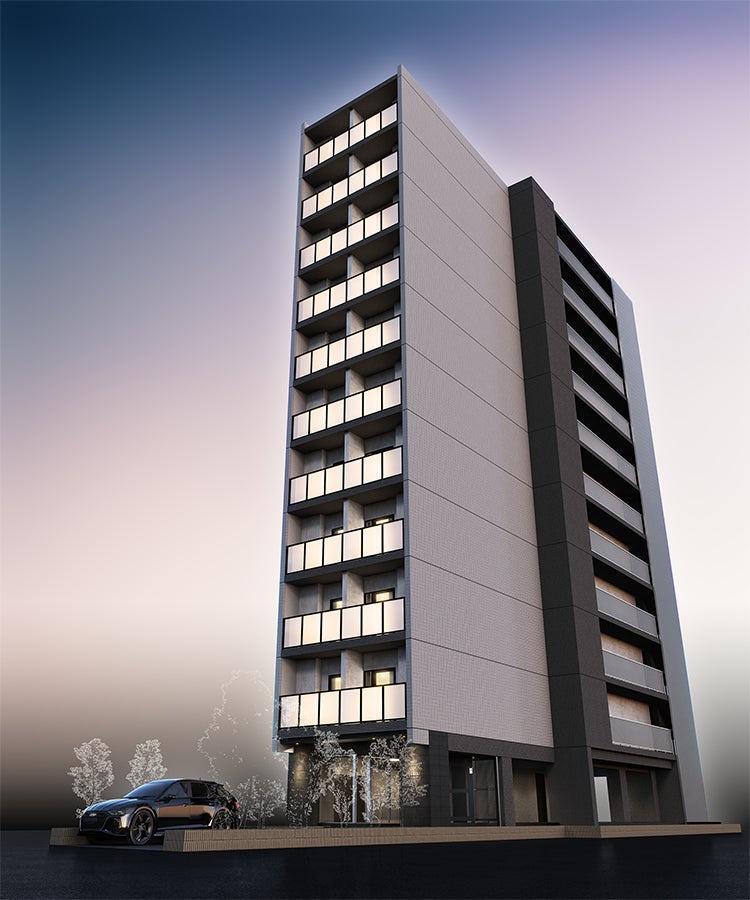 洗練された建築美とスタイリッシュなフォルムが、街の風景のなかで存在感を漂わせるファサードデザイン。ホワイト・グレー・ブラックを基調とした表情の異なる外壁のタイルは重厚感溢れる佇まいを創出。ライン照明の柔らかい光でプライベート空間への迎え入れるエントランスホールをくぐると、ラグジュアリー感を纏うホテルライクな内廊下が高級感溢れる空間を演出します。