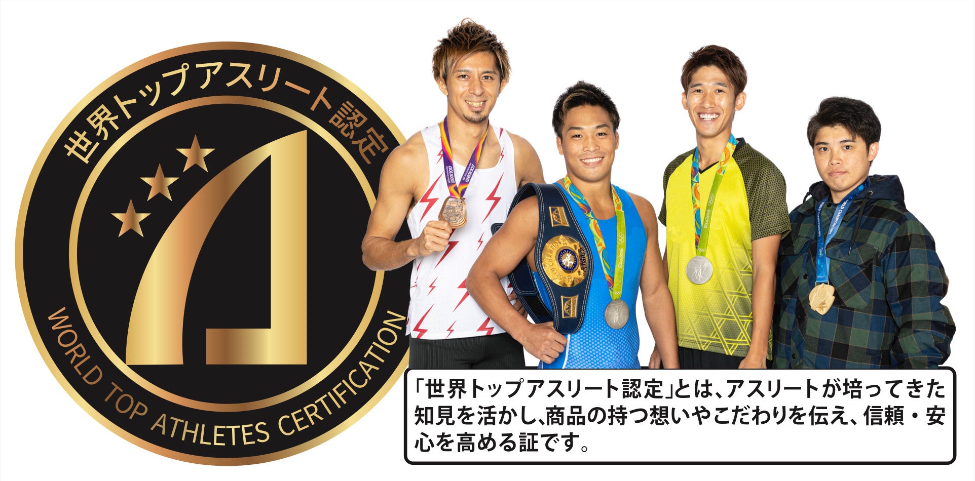 世界トップアスリート認定とは、食・睡眠・健康・怪我の予防・科学的データなど様々な知見を活用し、肉体作り・戦略立案・自己分析を行うアスリートが最大29項目の定量審査と、アスリート自身が使用感を確認する定性審査で総合的に判断し、本当に良いと思う商品のみを認定し、国内外に認知拡大、購買へつなげていく制度です。