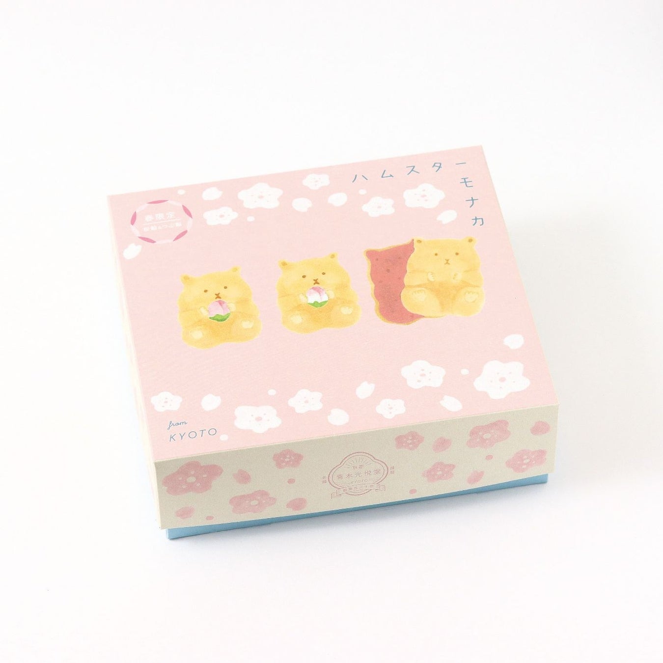 創業130年の京都の老舗菓子屋「青木光悦堂」とユニークな商品企画を専門に行う京都の企画デザイン会社「株式会社2時」がコラボして作った「ハムスターモナカ」の春限定バージョンの販売が2月24日(金)AM10:00より青木光悦堂オンラインショップで販売開始します。モナカ皮x6個、桜餡x3個、つぶ餡x3個、桜のつぼみ型のらくがんx6個がセットになっており、ご自身でモナカに餡を詰めてお楽しみ頂けます。甘すぎない上品な餡とパリッと香ばしいモナカがなんとも言えないハーモニーで、見た目だけでなく美味しさにもしっかりとこだわった商品です。ハムスターモナカのおなか部分が少しくぼんでおり付属の桜型らくがんを置くと、まるでハムスターが桜の花を持っているように見えます。手土産やギフトにもぴったりな春らしいパッケージで数量限定発売です。