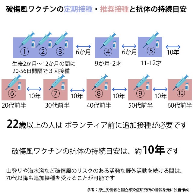 最終接種から10年以上経過している場合は、被災地ボランティアに向かう前に必ず予防接種を受けるようにしましょう。例えば、12歳の時に受けた二種混合DTワクチン(ジフテリア・破傷風)が最後であれば、22歳が破傷風ワクチン追加接種の目安の時期です。