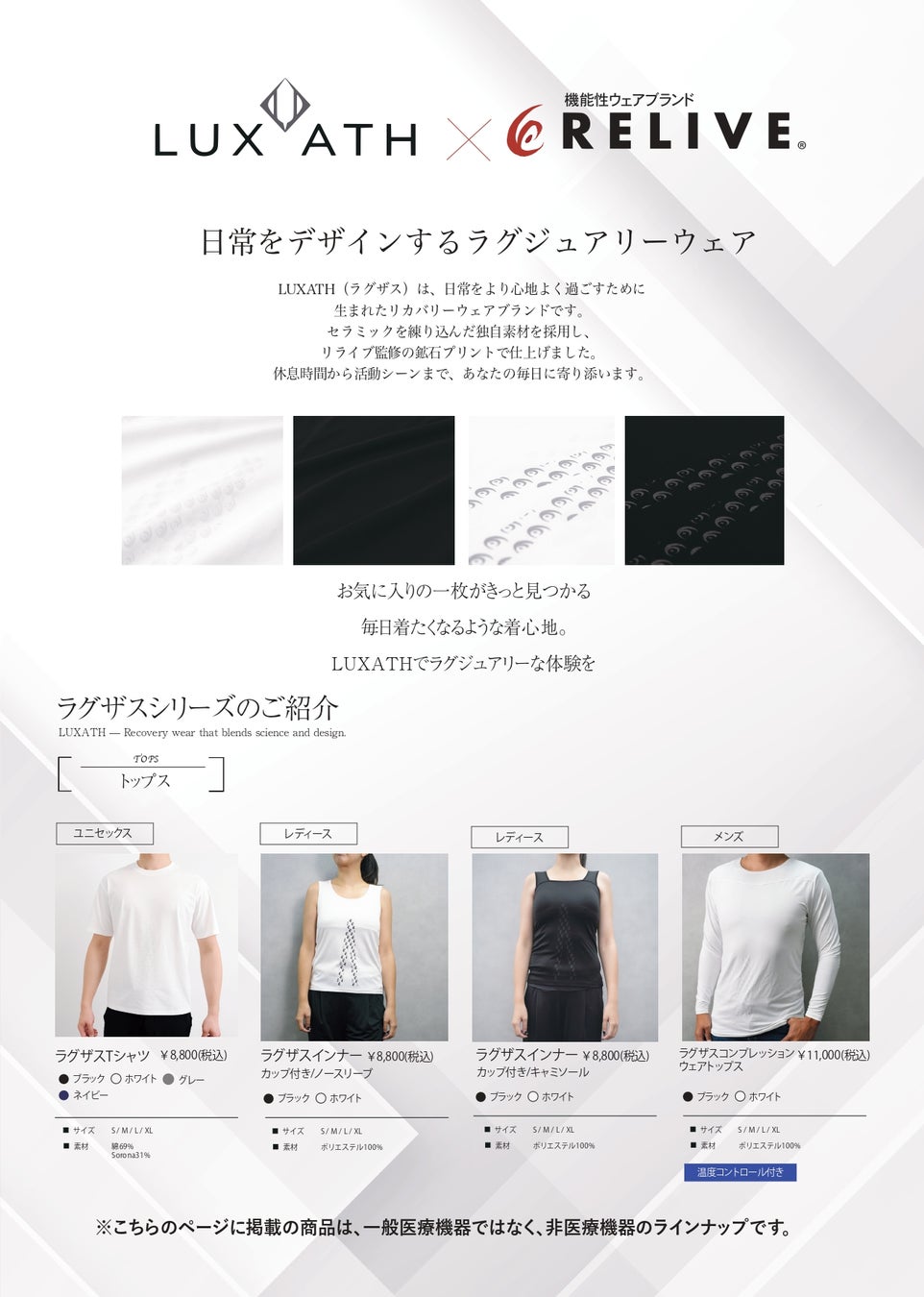 「LUXATH(ラグザス)」は、株式会社りらいぶ加工監修による正式なコラボレーション商品として、機能性・安全性・信頼性を高いレベルで両立。全国の販売店様と連携し、より多くのお客様に“着る健康サポート”を自信を持ってお届けしてまいります。