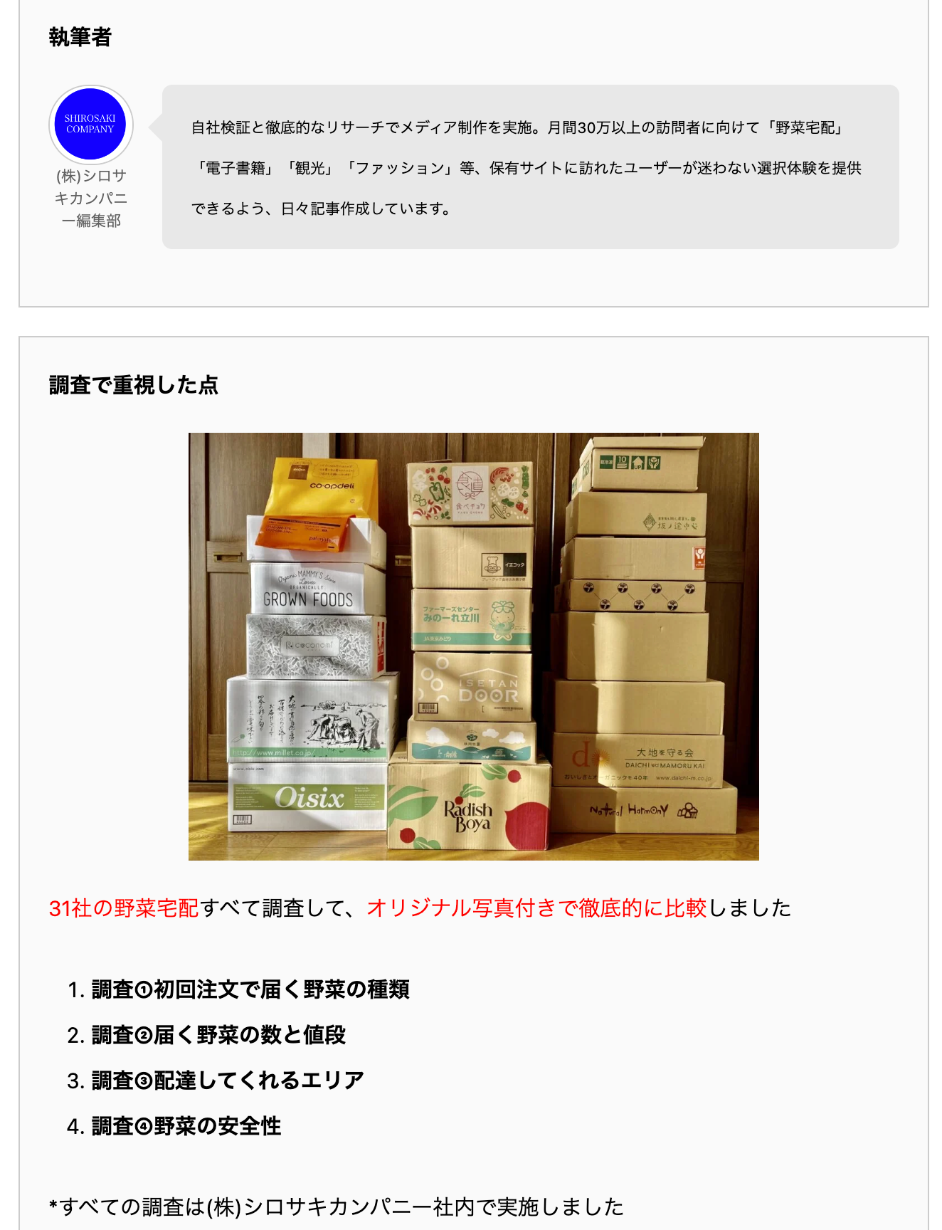 野菜宅配の香りのサイト運営者の透明性の確保のために、野菜宅配の香りの執筆者と調査で重視した点を追記しました。
