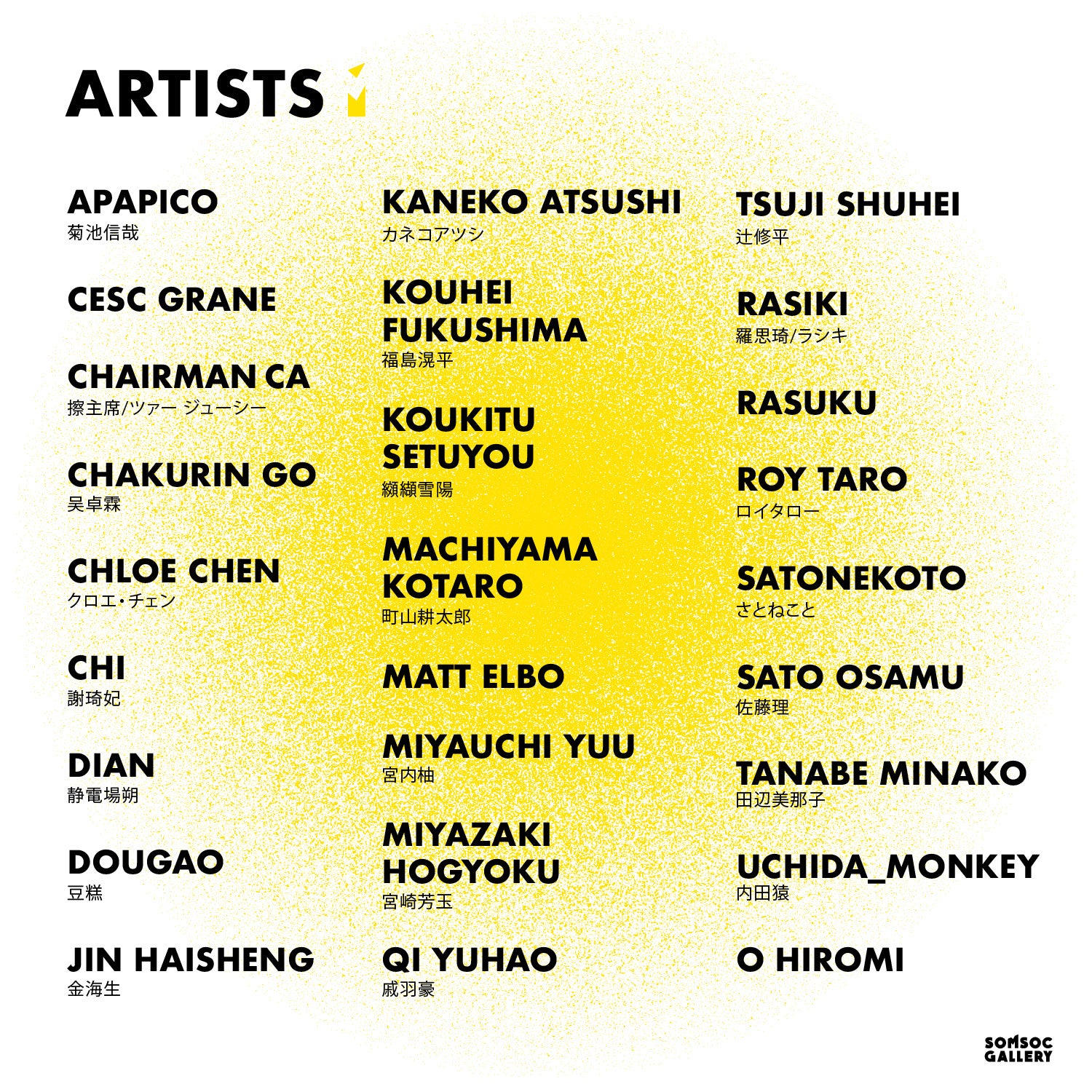 アーティストとコレクターをつなぐのはもちろんのこと、アートに馴染みのない方々に「分からない」ではなく、自分の好き嫌いで見てもらえるような「つながり」の機会を提供いたします。様々な国籍、年齢、ジャンル、表現手法。SOMSOC GALLERYが選りすぐった約30名のアーティストの作品が原宿、SOMSOC GALLERYに集結。彼らが織りなすアートの饗宴を、GALLERY併設カフェのフルーツティーでも飲みながら気軽にご堪能ください。また今回は10月に当ギャラリーが参加する中国アモイでのアートフェアのプレ展示も兼ねています。今後SOMSOC GALLERYは原宿を基地として、主に東アジアのアートシーンを海外へ発信していきます。