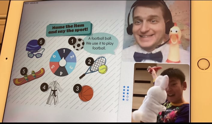 「英会話をしながら先生がタブレット画面上に出す問題に直接タッチして書き込みながらゲームに答えたり、とにかく楽しそうです。新しい単語を学んだり、文法もある程度は分かっていましたが、言い間違いを先生が直してくれます」
