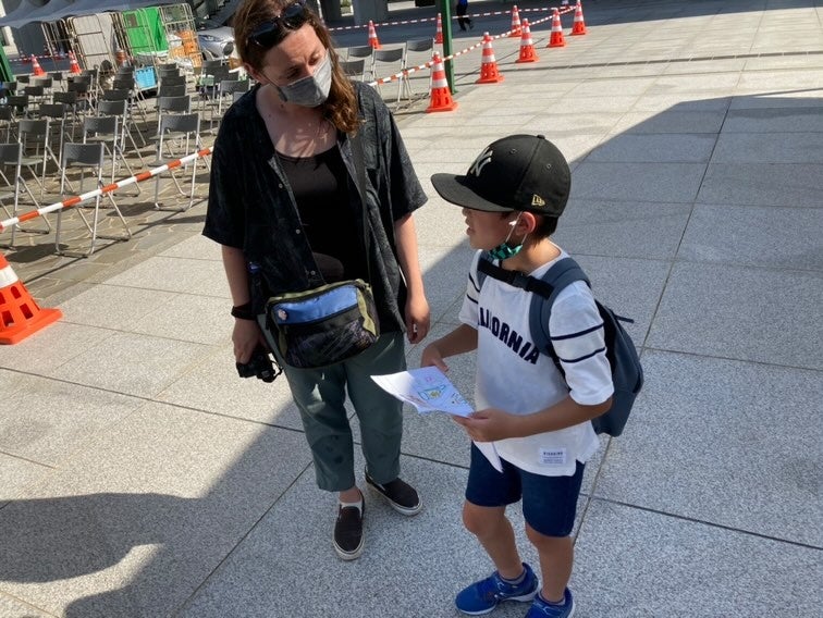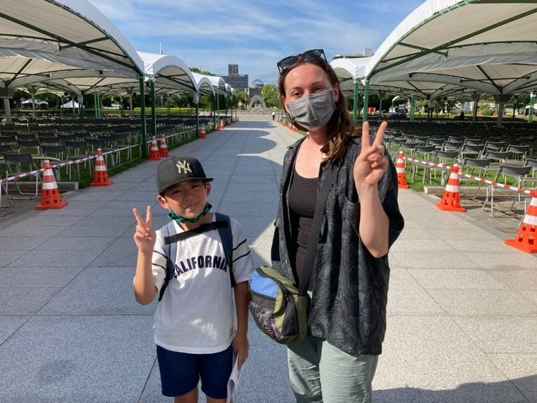 駿くんは昨年、地元広島を英語で紹介する動画企画に参加したことをきっかけに、広島の原爆ドームについて興味を持ち、お母さんと一緒に戦争の歴史や原爆について調べるようになりました。実際に広島平和記念資料館を訪れ、外国人が使用する説明翻訳イヤホンをつけて館内を閲覧し、英語での説明方法を学び、自宅で動画サイトに上がっている原爆についての英語動画を見て勉強しました。そこで得た知識と英語力を実際に活かそうと、2021年8月6日の原爆の日から平和記念公園で原爆ドームの説明を外国人観光客にし始めました。