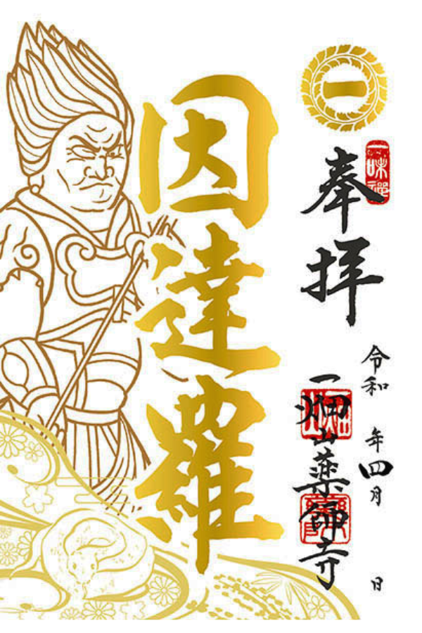 一畑山薬師寺が、4月限定「箔押しご朱印」を公開。4月のご朱印は「お薬師」様・「因達羅(いんたら)大将」様