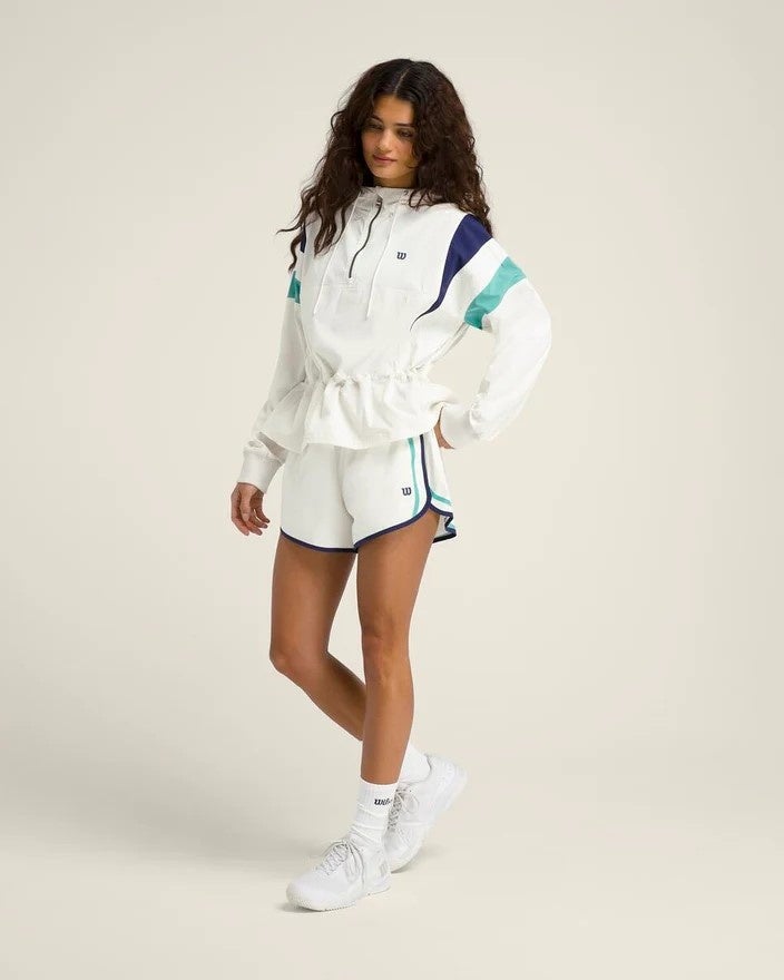 伸縮性のある生地を使用し、簡単に着脱できるハーフジップを備えているため、ウォームアップやコートへの行き帰りに最適な1枚。ドローコード付き。