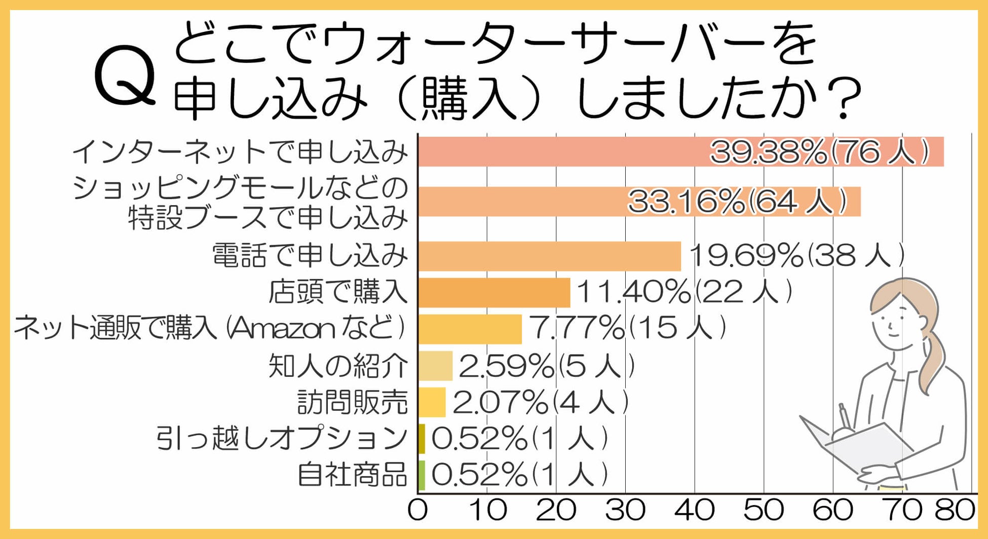 ■ウォーターサーバーは「ネット申し込み39.38%(76人)」が人気!