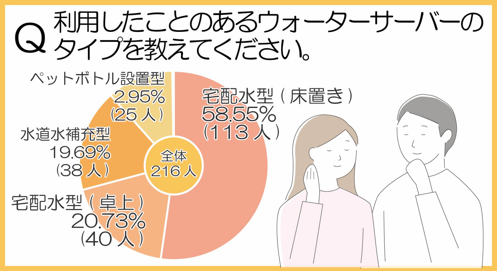 なお、「宅配水型」の「床置き」と「卓上」を比較した場合、「床置き」が73.86%(113人)「卓上」が26.14%(40人)となり、卓上よりも床置きが人気とわかりました。