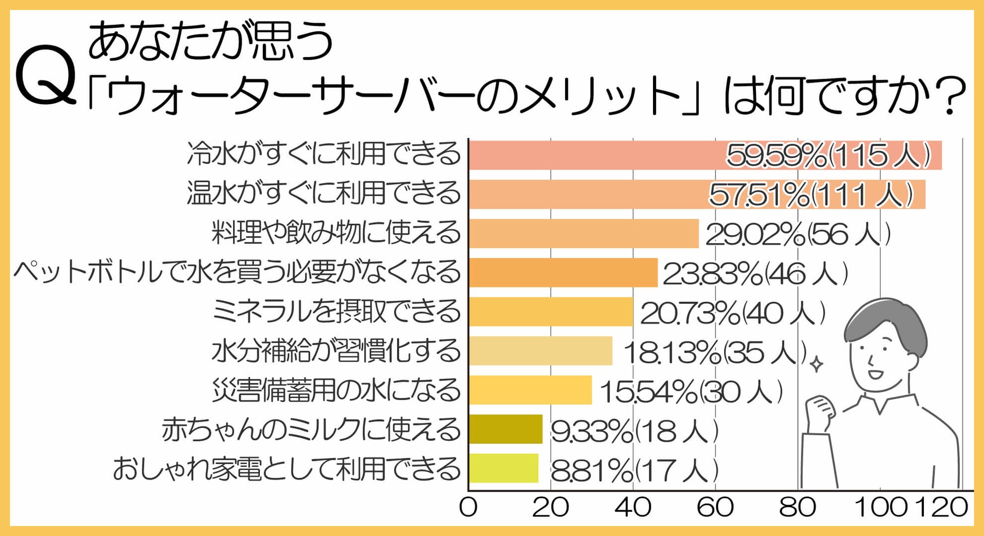 ウォーターサーバーのメリットは、「冷水がすぐに利用できる57.51%(111人)」と「温水がすぐに利用できる59.59%(115人)」が特に多かったです。さらに4番目に多い回答は「ペットボトルで水を買う必要がなくなる23.83%(46人)」でした。
