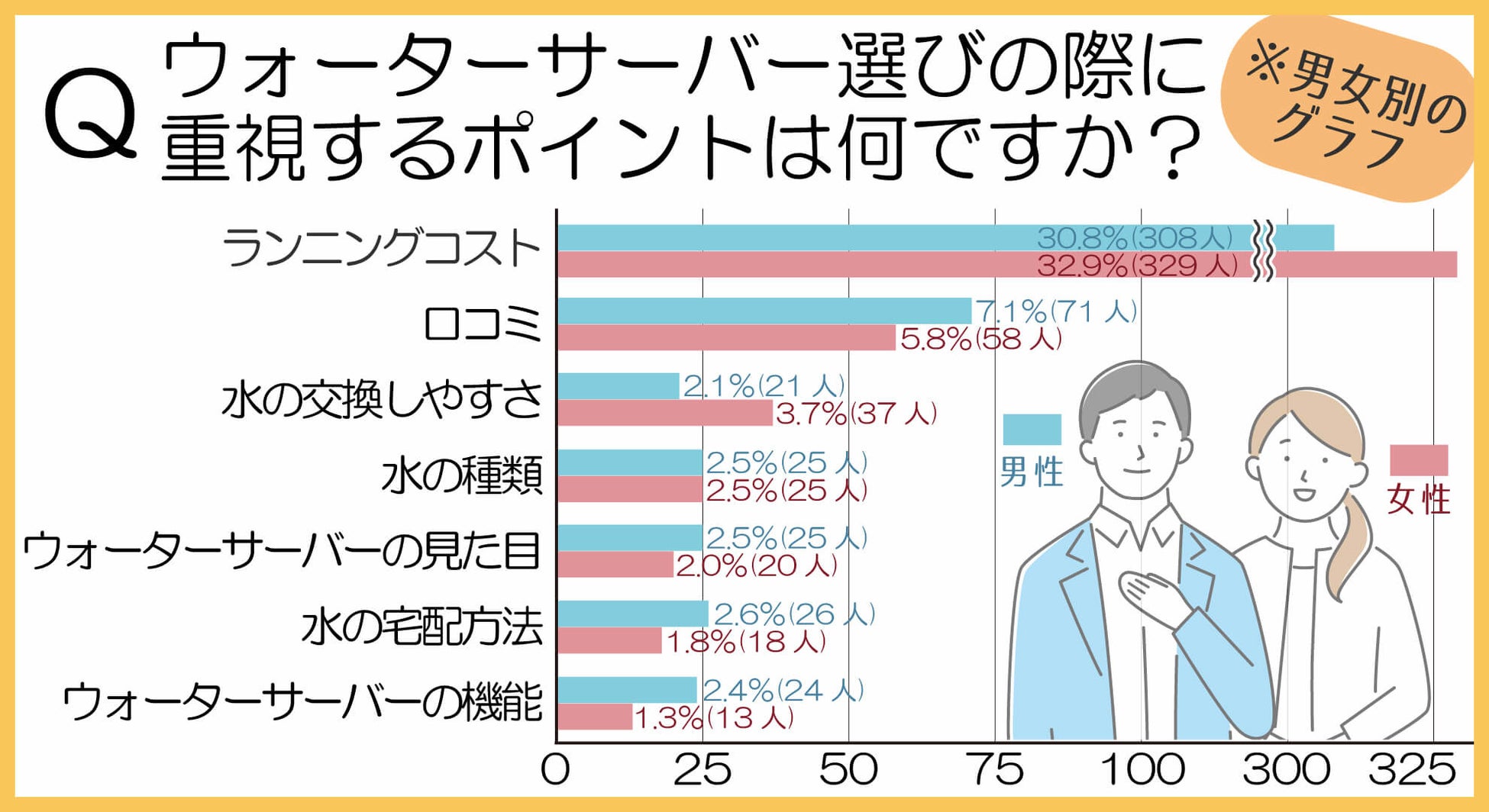 上記のように、男女でウォーターサーバーの選び方ポイントが異なりました。