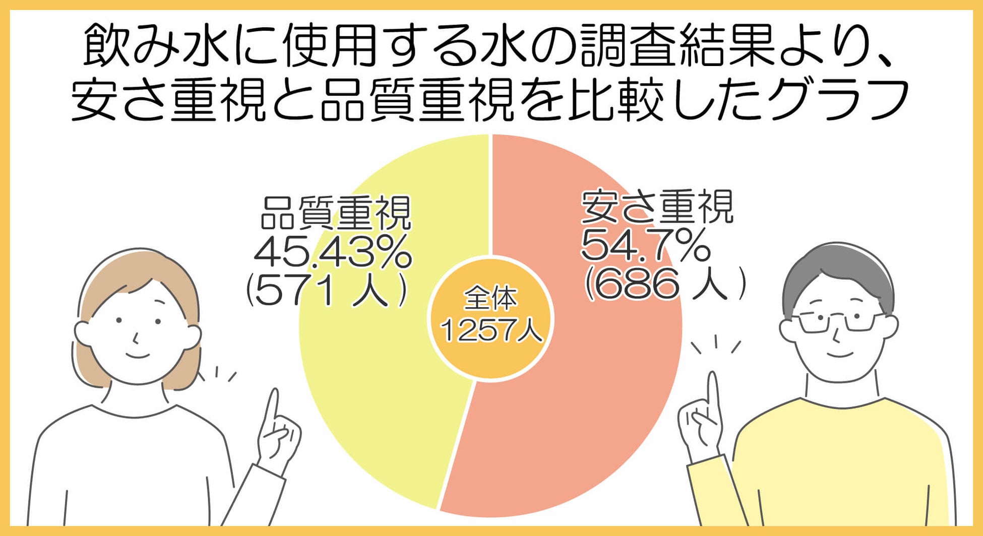 結果は「安さ重視54.7%(686人)」「品質重視45.43%(571人)」となり、「安さ重視」が9.27%多かったです。飲み水に使用する水は、品質より安さを重視する傾向にあるのでしょうか。