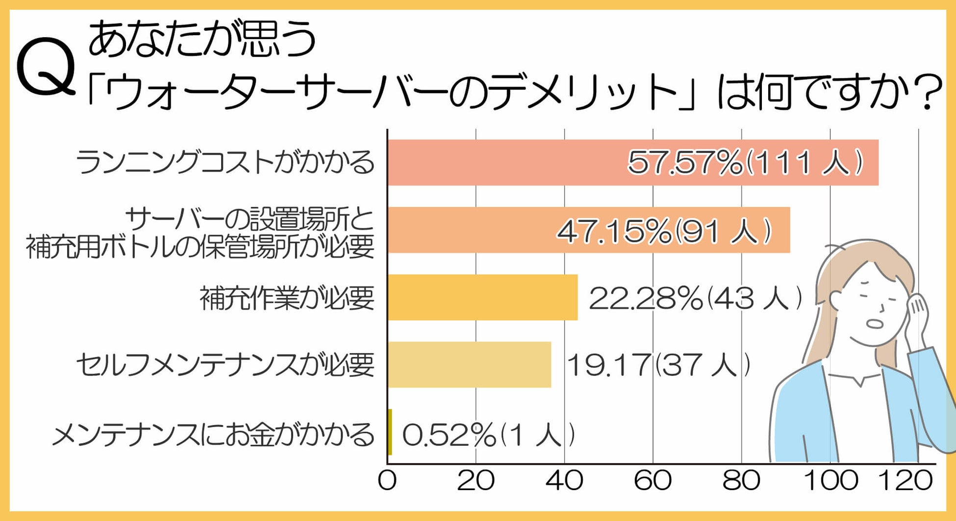 ウォーターサーバーのデメリットで最多は、「ランニングコストがかかる57.51%(111人)」でした。