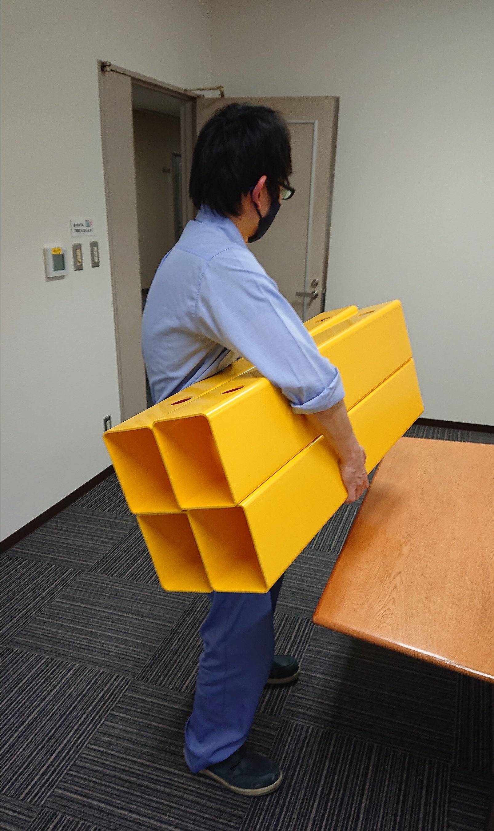 中空樹脂のため、1本の重さが3.3kgと軽量で(鋼製の半分以下の重さ)、最⼤4本同時に持つことが可能です。