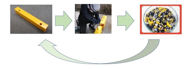 フォークガード材は鋼鉄製が一般的ですが、衝突した際に傷の塗りなおしなどの補修が必要となり、またフォークリフトに傷がついてしまうという課題があります。更に、重いため施工・加工を行なう現場作業者の負担が大きく、また持続可能な社会に向けた取り組みに向けたリサイクル性という観点も求められています。