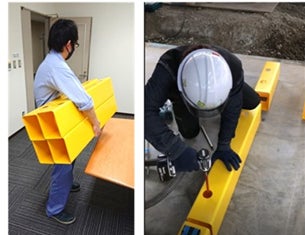 フォークガード材は鋼鉄製が⼀般的ですが、衝突した際に傷の塗りなおしなどの補修が必要となり、またフォークリフトに傷がついてしまうという課題があります。更に、重いため施⼯・加⼯を⾏なう現場作業者の負担が⼤きく、また持続可能な社会に向けた取り組みに向けたリサイクル性という観点も求められています。