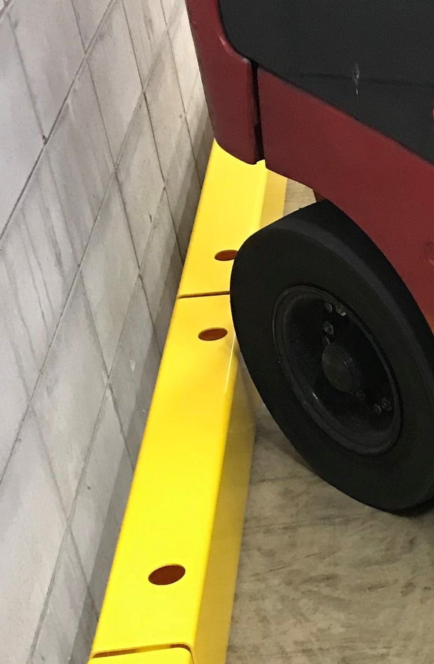 そのため、壁⾯破損を予防するため、フォークリフトの衝突を回避させるための視認材を設置するケースが増えてきていますが、現状は鋼製が主流です。それを樹脂化したのが本品になります。