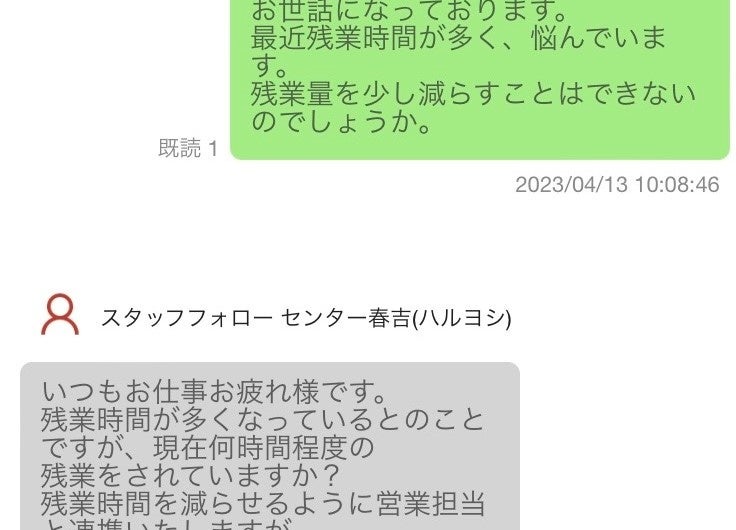 辞めるかどうか考えていた時にフォローセンターからのフォローメッセージが届いた。今まで誰に話していいかわからないような悩みにも、フォローセンターに連絡ができるという新しい手段があるのを心強いと感じた。