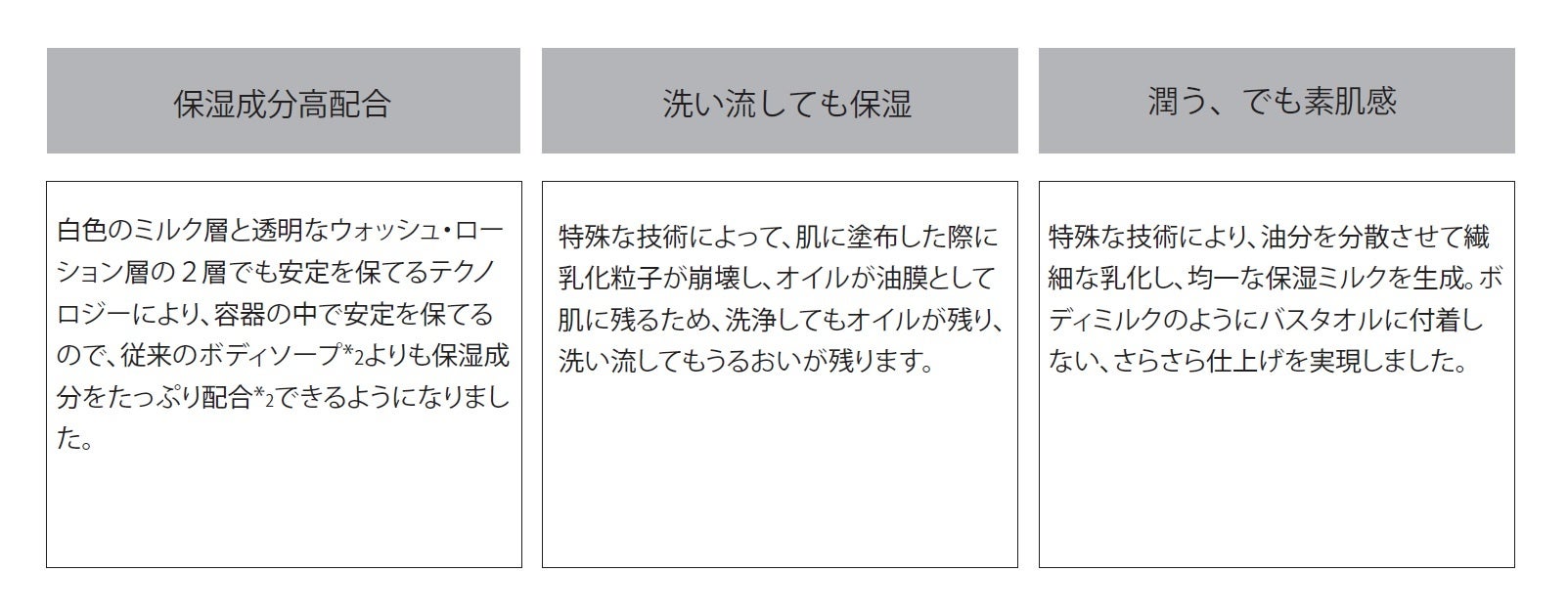 ボディソープ、ボディローション、ボディミルクの機能をこれ1本で実現。