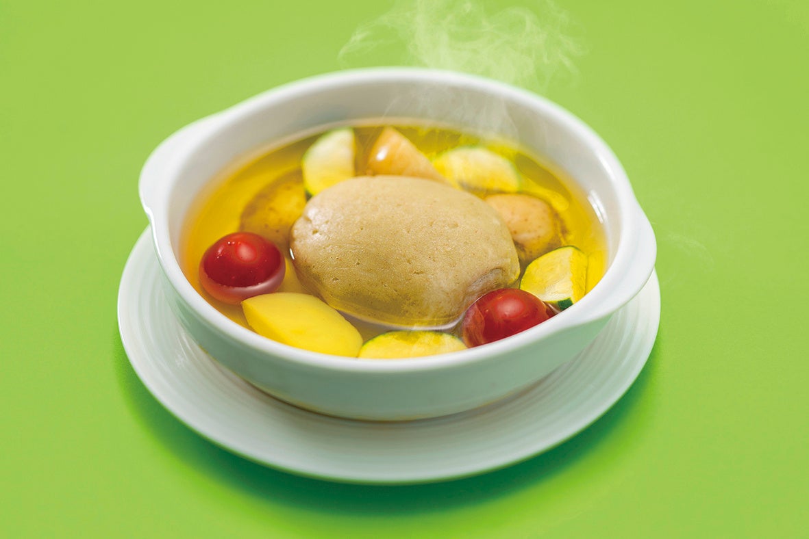 蕎麦粉を餅状にした“そばがき”に、2種の植物性チーズを練り込みました。鰹出汁 は使わず、トマトとズッキーニ、ジャガイモと一緒にアヒージョ仕立てにした、他ではあまりお目にかかれないメニューです。