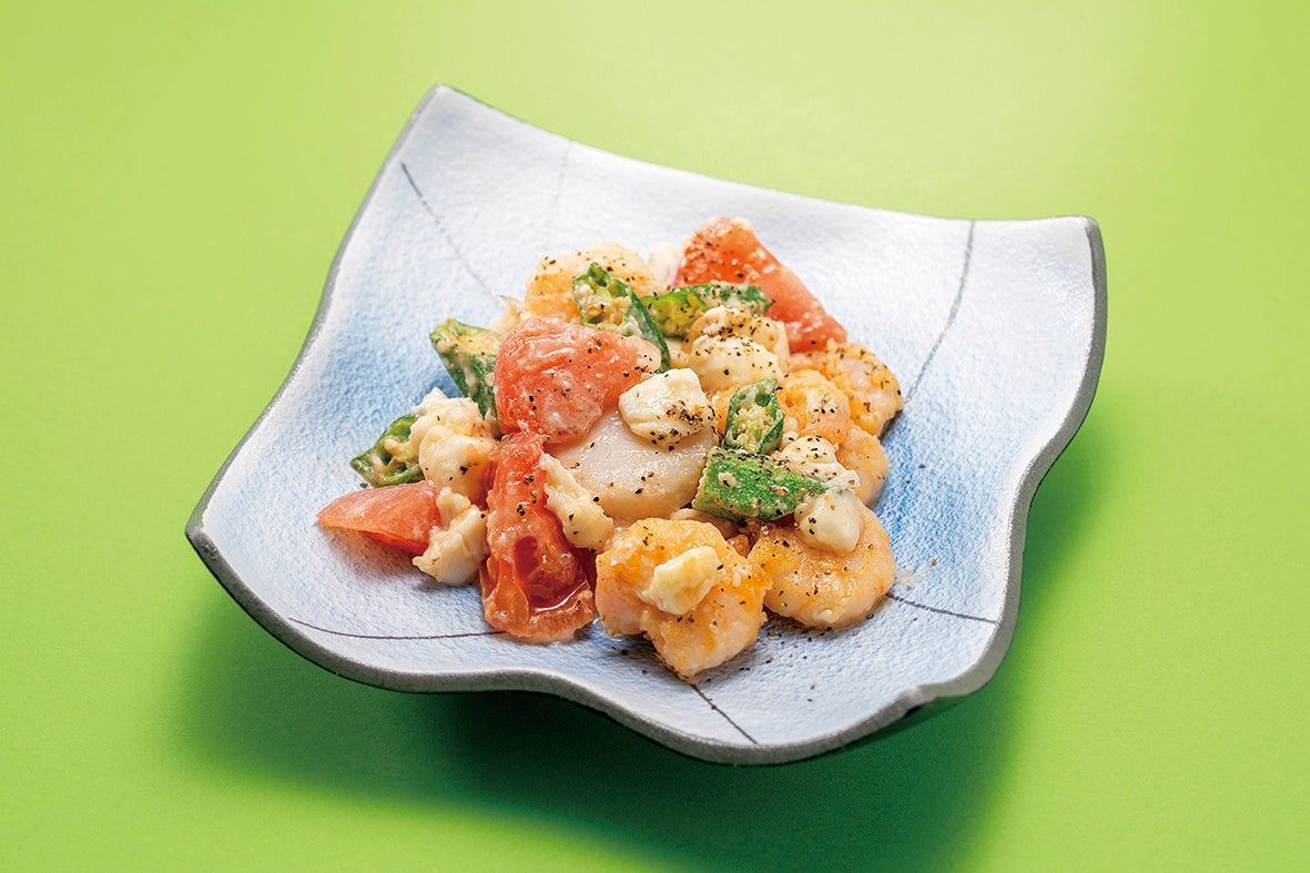 夏の人気野菜トマトとオクラを、旨味の強い海老・ホタテ、植物性チーズと一緒に炒めました。クリーミーなチーズの風味とさっぱりとした塩味で、ご飯だけでなくお酒のお供にもオススメです。