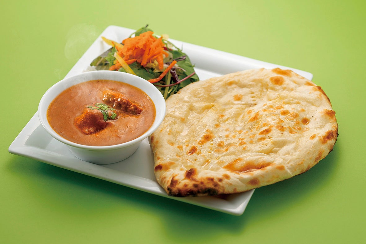 植物性チーズを練り込んだオリジナルナーンと、お好きなカレーが8種類から選べるセットメニュー。窯でトロ~リと溶けたチーズの風味をお楽しみください。