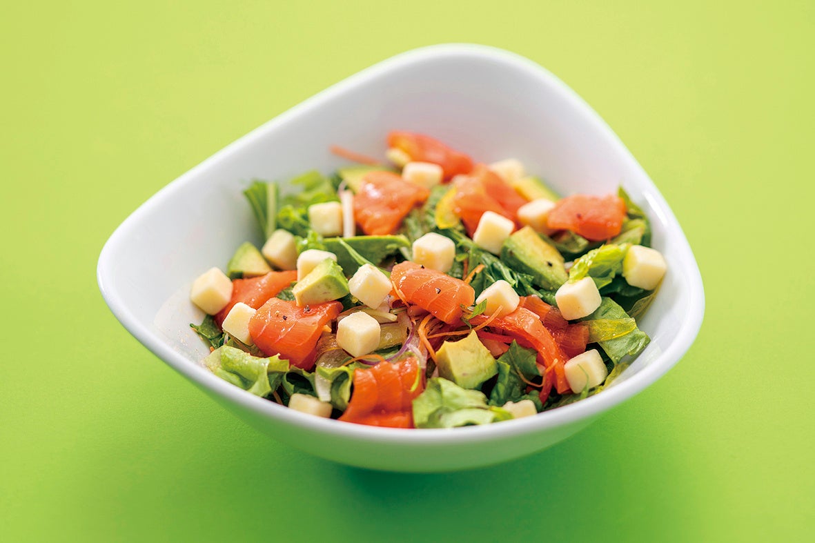 上品な脂が乗った旬の国産トラウトサーモンに、水菜やアボカドを和えたサラダ仕立てのカルパッチョ。濃厚で深みがある植物性チーズが、味と食感のアクセントに。