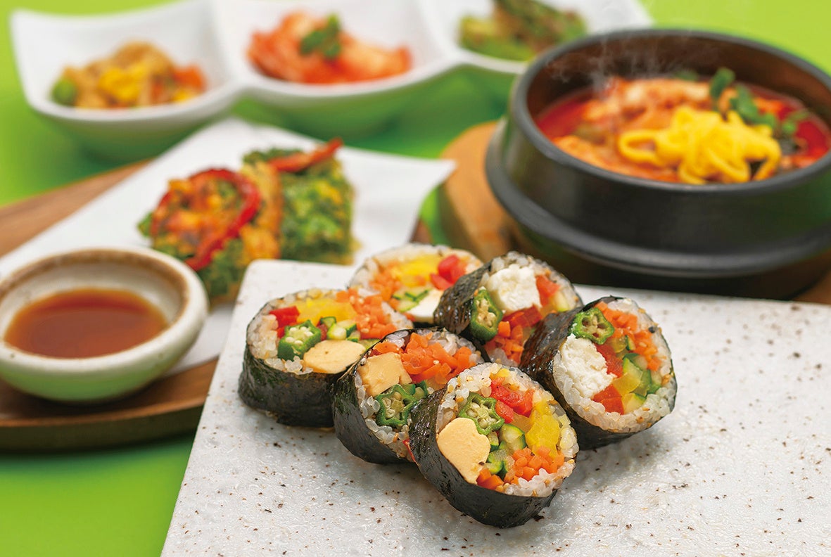 肉や魚を使わず、たっぷりの夏野菜とクリーミーで濃厚な植物性チーズで作った 新感覚の“韓国風海苔巻き”。ヘルシー鶏肉の旨辛スープ“タッケジャン”と自慢の海鮮ケールチヂミ、日替わりおかず3種も付いたお得なセットです。
