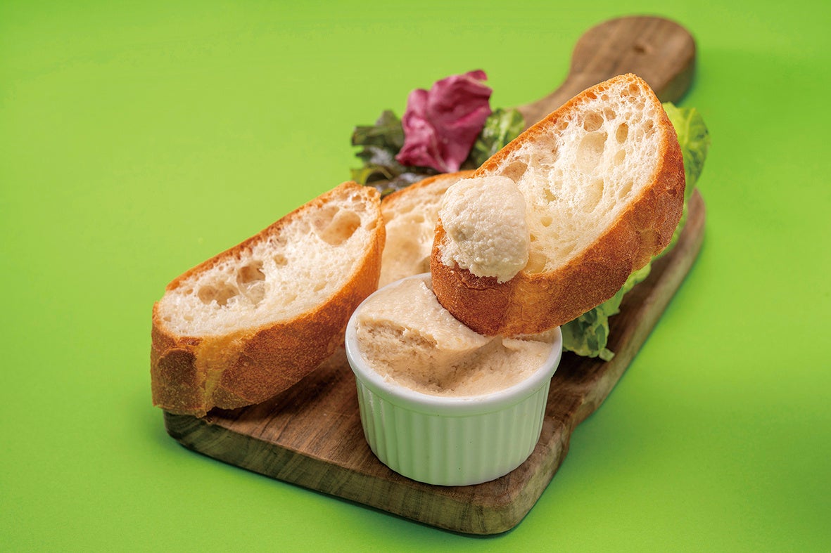 さっぱりした鶏ムネ肉と、植物性チーズを合わせたクリーミーなムース。バゲットに付けて、ワインやビールと一緒に濃厚な味わいをお楽しみください。