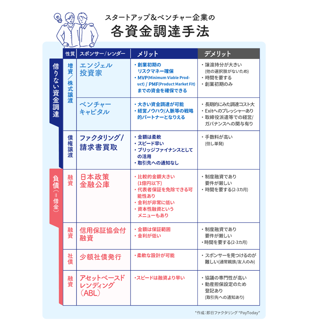 資金調達は、大きくデットファイナンスとエクイティーファイナンスの2つに分類できます。デットファイナンスは融資や社債調達を指します。エクイティーファイナンスは、株式発行による資金調達(もしくは株式譲渡)の手法が用いられ、スポンサーはエンジェル投資家/ベンチャーキャピタル等が選択肢となります。エクイティーファイナンス、融資、社債、ABL、ファクタリングを“借りない資金調達”と“負債”という2つに大きく分類し、メリット/デメリットを分析しました。