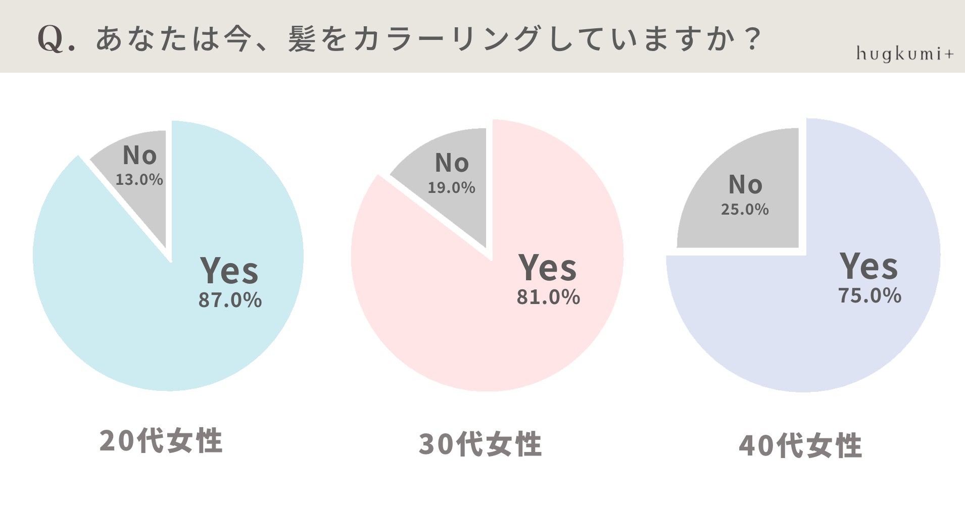 アンケートによると現在ヘアカラーをしている女性は、20代が87.0%、30代が81.0%、40代が75.0%。20~40代でみても81.0%と多くの人がヘアカラーを楽しんでいます。