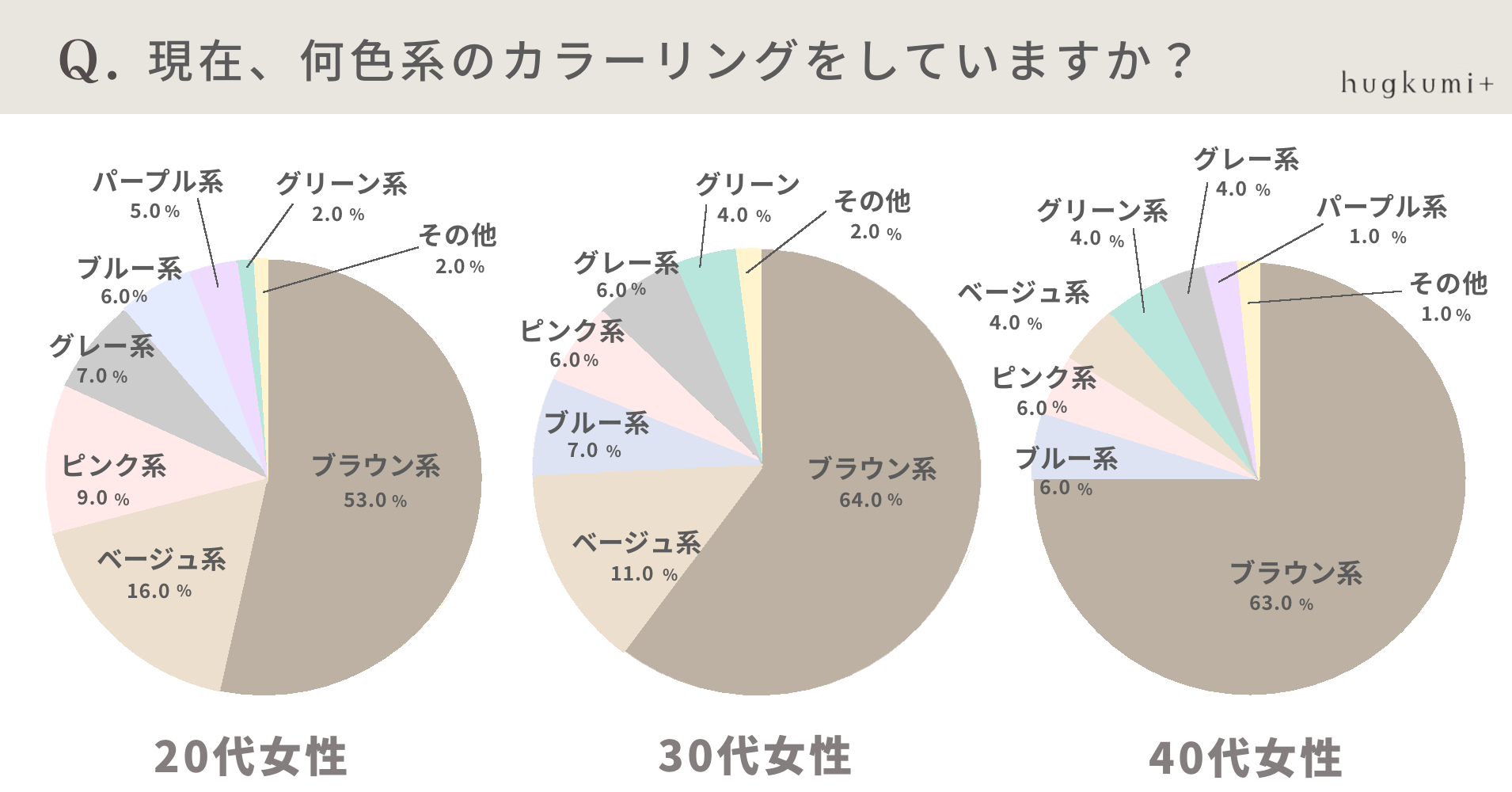髪色で言うと「何色系のカラーリングをしていますか?」というアンケートでは、年齢が上がるたびに落ち着いたブラウンの比率が高いものの、軽やかなベージュ系に続いてピンクやブルーなどの華やかな色も。
