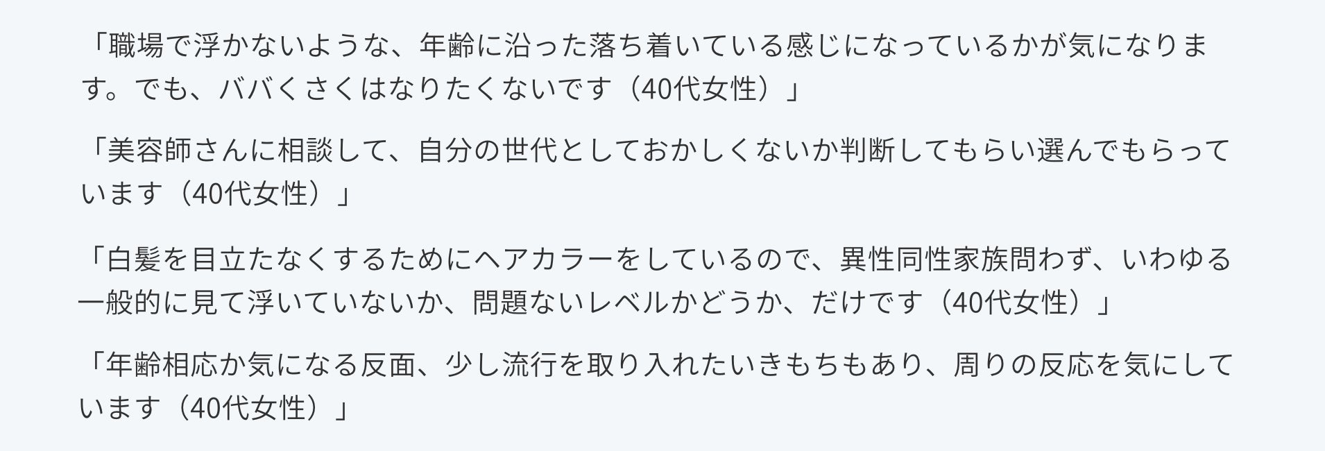 40代になると自分の立場はもちろん、年齢に対して違和感がないか、気にしないわけにはいかないものの、だからといってただ老け込むのではなくおしゃれは楽しみたい、そんなジレンマもあるようです。