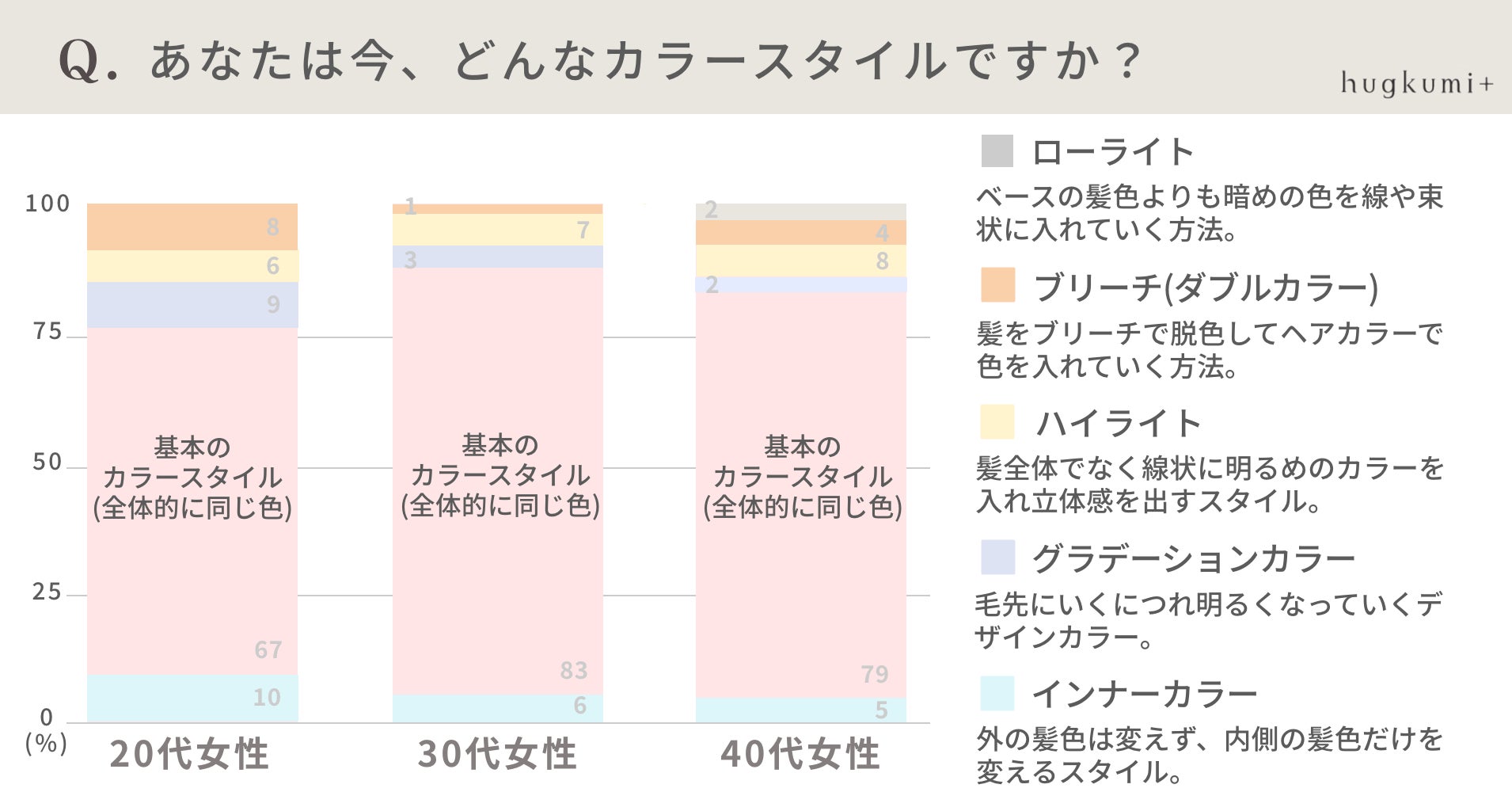 「現在、どんなカラースタイルですか?」と聞いたところ、全体を同じ色に染めたオーソドックスなスタイルが全世代で半分以上を占める中、内側を染めるインナーカラーや毛先に向かって他の色に徐々に変わっていくグラデーションカラー、明るいカラーを部分的に入れるハイライトなど、さまざまなスタイルが選ばれていました。