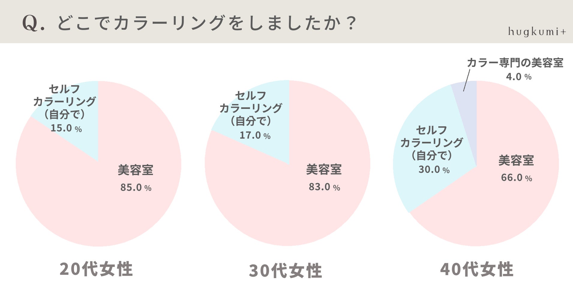 「いつもどこでカラーリングをしますか?」という質問の回答も、「美容室」と回答したのが20代は85.0%、30代は83.0%なのに対し、40代は66.0%。