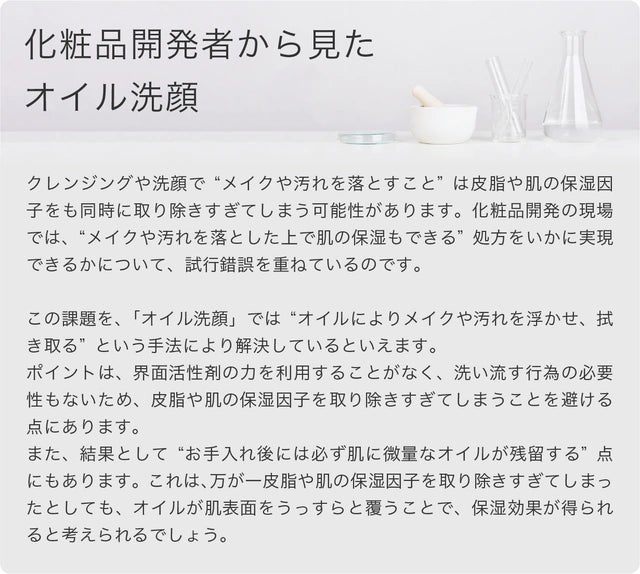 そこで、特殊なオイルを組み合わせることで、軽めのメイクから、コンシーラーやウォータープルーフの日焼け止めのようなハードなメイクまで落ちるように独自処方を考えました。また、汚れを落とすだけでなく、保湿成分や美容成分を加えた、これまでにない新しい製品の開発を目指しました。