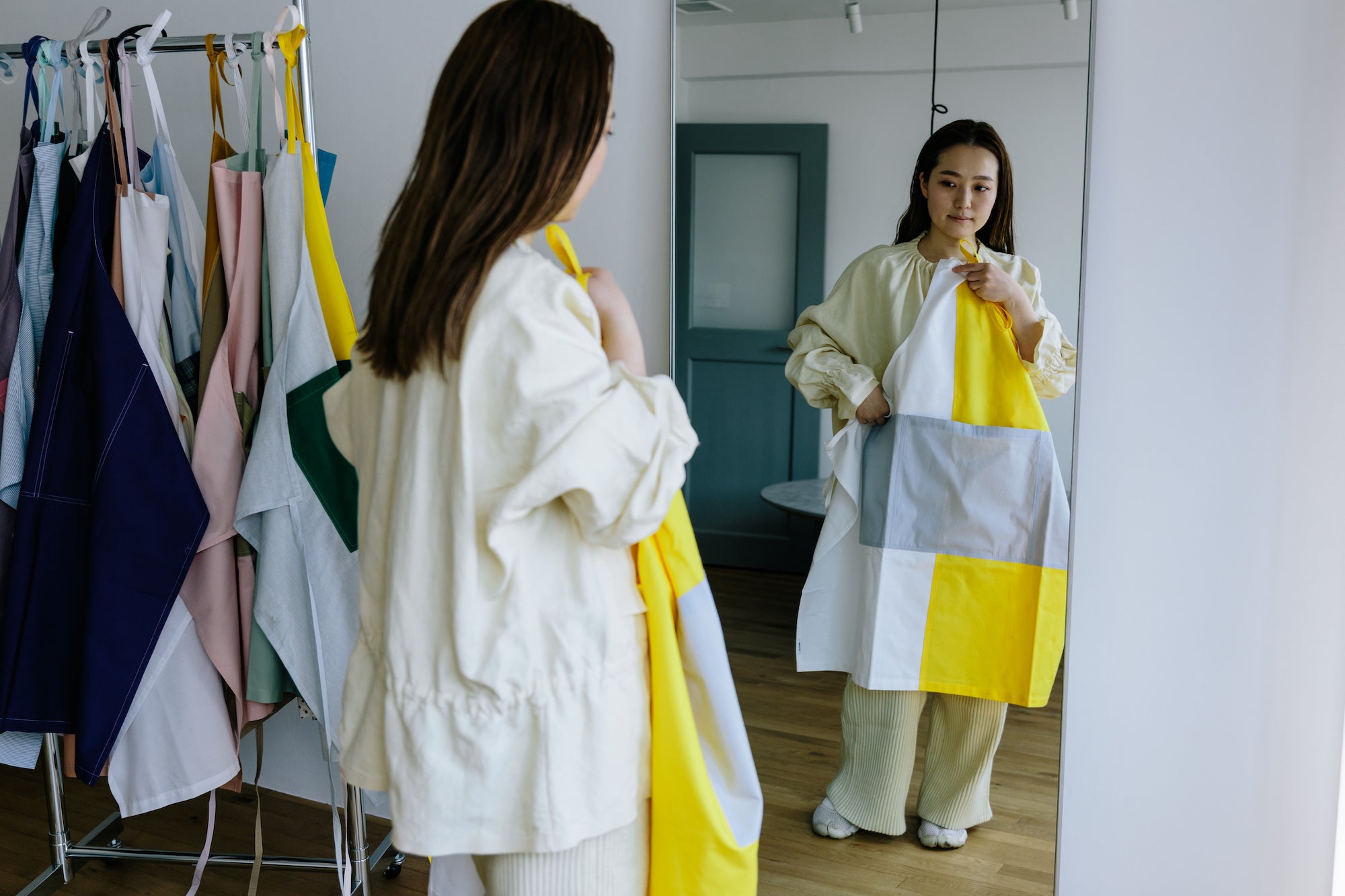 完成したエプロンのイメージ(モデル身長:左約120cm、右約100cm)