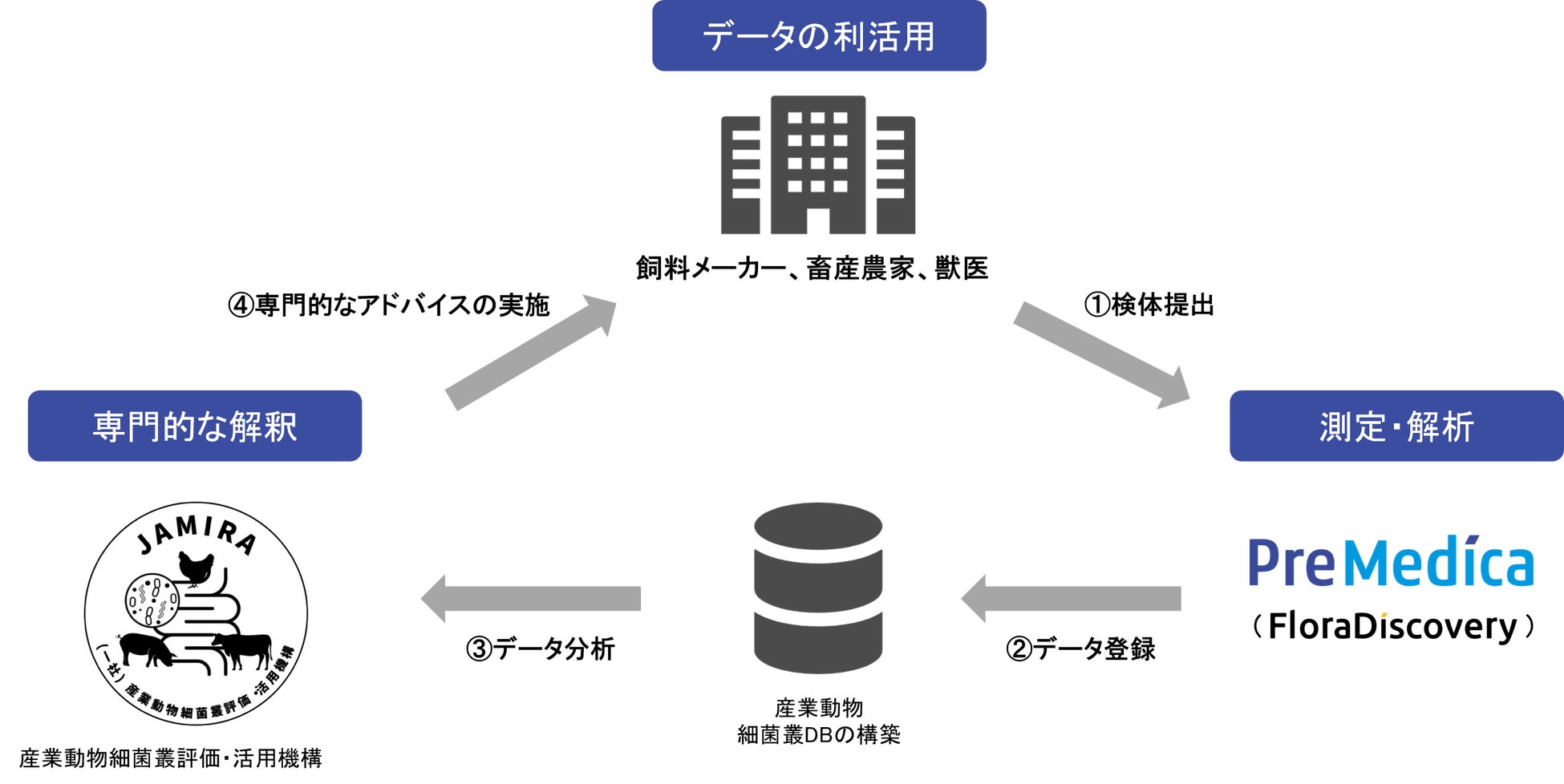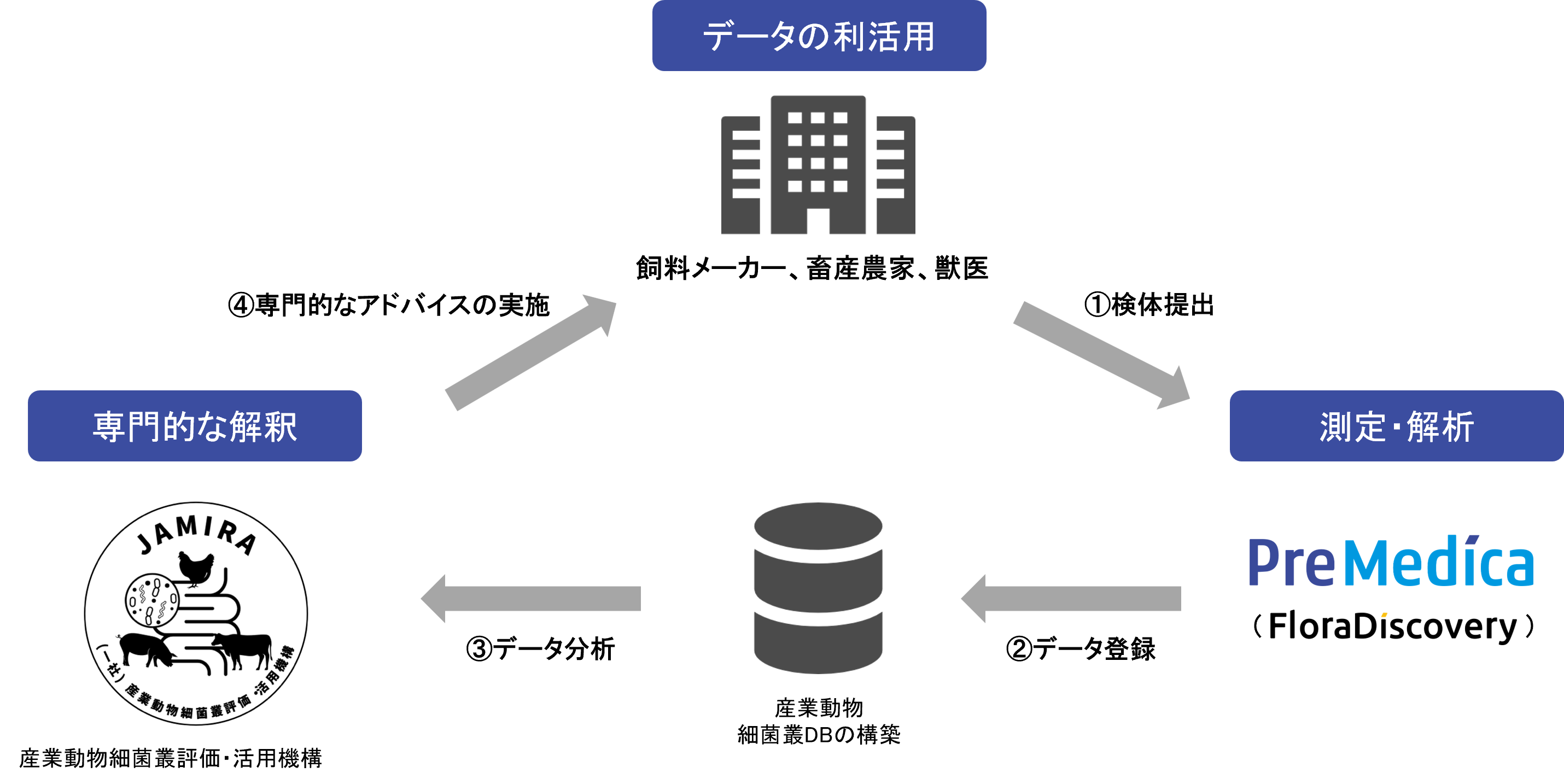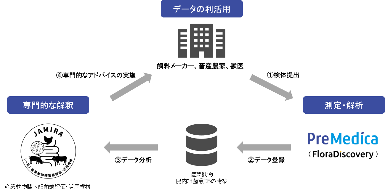 プリメディカにて腸内細菌叢の測定・解析を実施し、JAMIRAによる産業動物の腸内細菌叢の専門的な解釈を行うことで産業動物腸内細菌叢データベースの構築を目指します。蓄積されたデータは、生産成績の向上を目的とした飼料開発への応用など、飼料メーカー、畜産農家の皆様に利活用いただくことを想定しております。