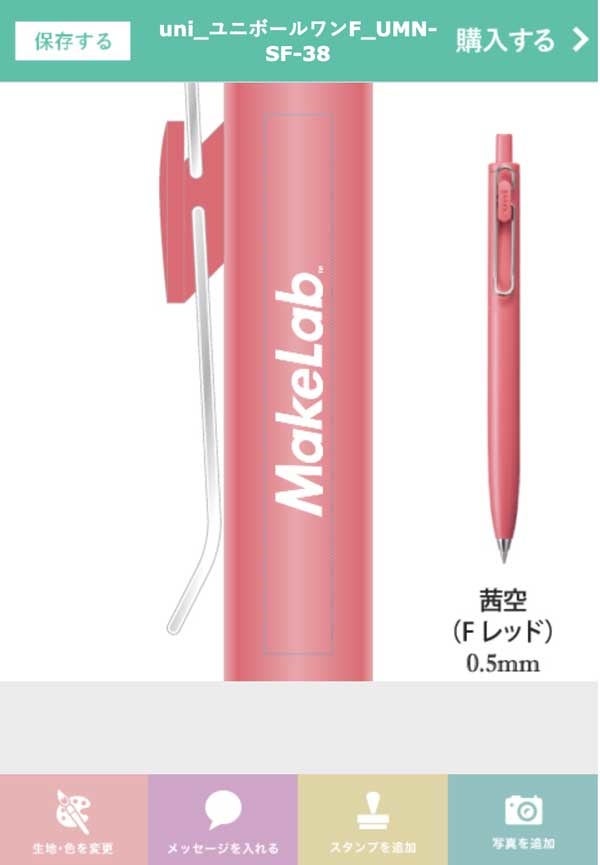 下記URLをクリックすると『ユニボールワンF(UMN-SF-38)』でオリジナルボールペン作りが体験できます。デザイン作成は無料。もしお気に入りのデザインができればもちろん購入可能!