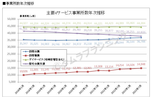 一方、居宅介護支援は減少傾向が鮮明となっており、2023年1月から2023年7月にかけて、422ヶ所減で推移している。但し、同サービスの利用者は増加傾向が続いており、大手運営事業者を中心に、事業所の再編や効率化などが一層進んでいると考えられる。