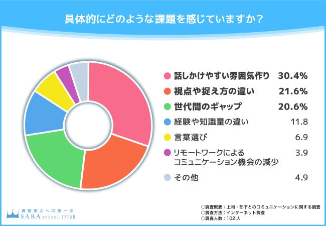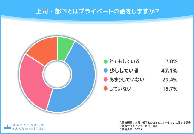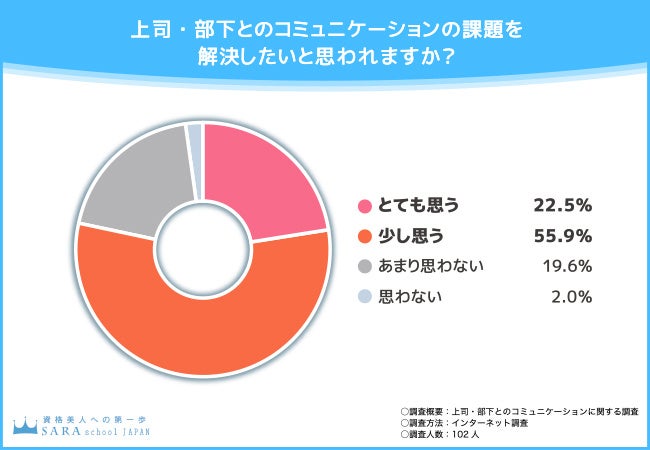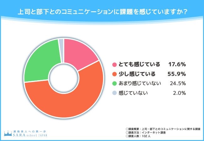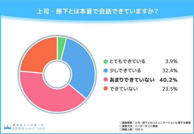 そこで今回、通信教育講座『SARAスクールジャパン』(https://www.saraschool.net/)を運営する株式会社新生技術開発研究所は、全国の男女102名を対象に「上司・部下とのコミュニケーション」に関する調査を実施しました。