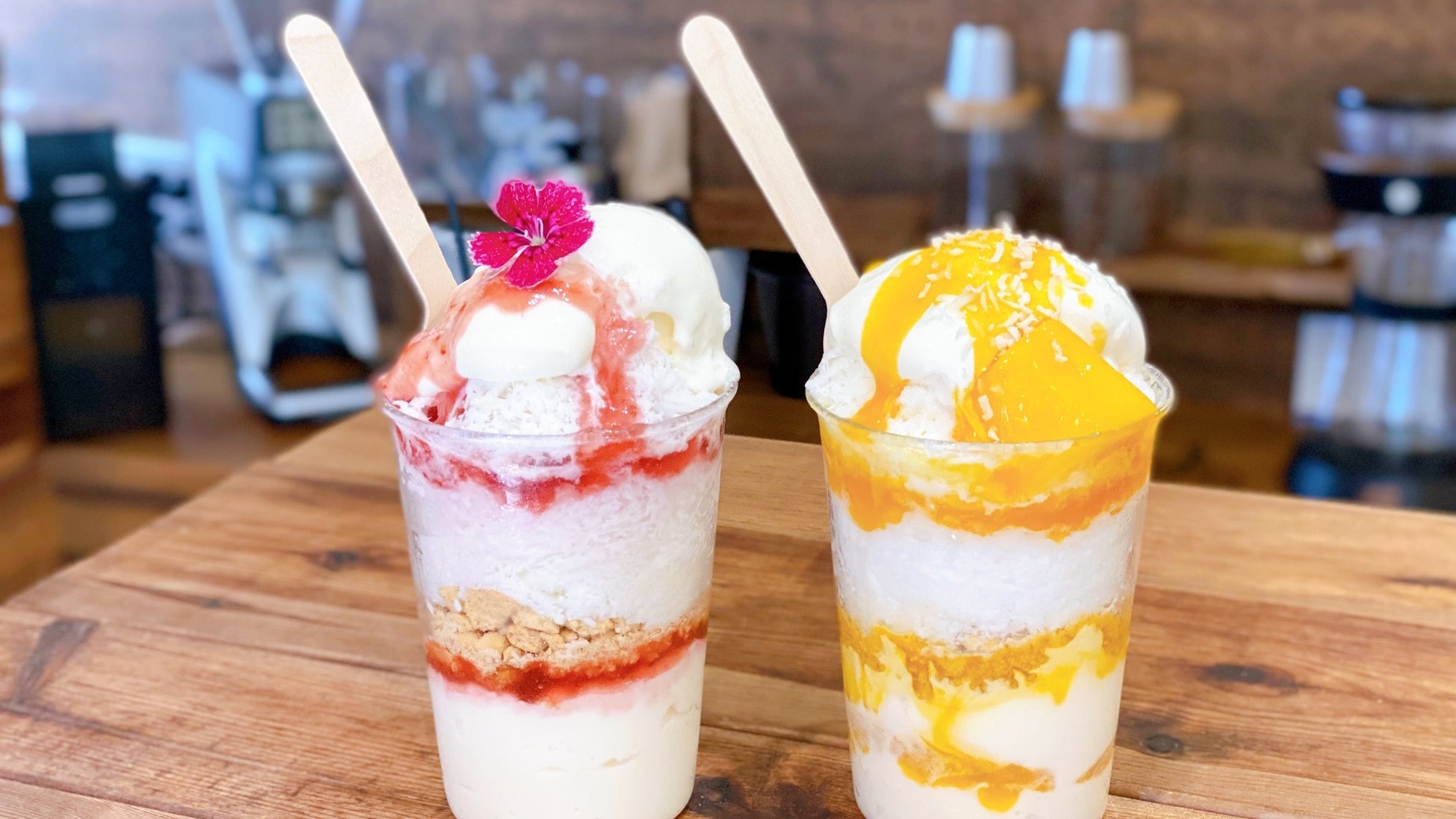 つるんとしたジュレやしっとりとシロップを吸い込んだスポンジ、ザクザクとした食感のパーツにアイスクリームもトッピング。まるでパフェのようなかき氷です!
