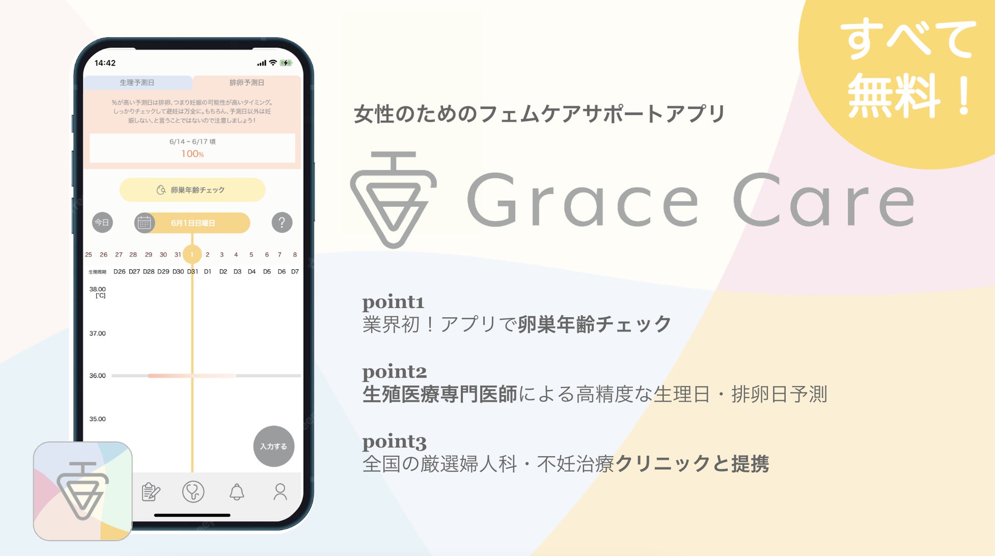 株式会社グレイスグループ(本社:東京都渋谷区、代表取締役:勝見祐幸、以下「グレイスグループ」)は、不妊治療の第一線で活躍する杉山産婦人科グループ杉山力一理事長の監修による、全国の厳選生殖医療クリニックとダイレクトにつながった新しいスタイルの生理管理・フェムケアサポートアプリ「Grace Care」をリリースします。