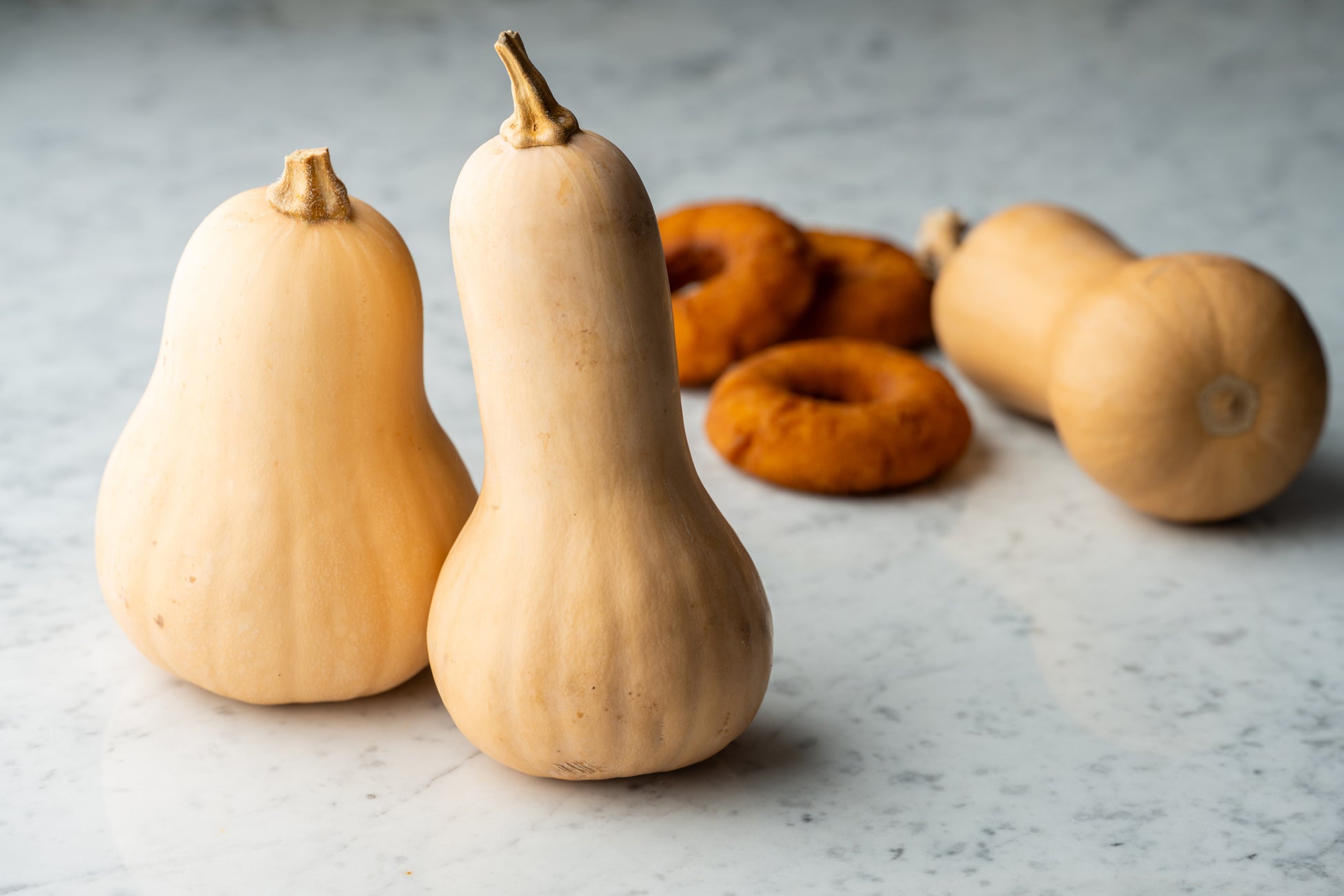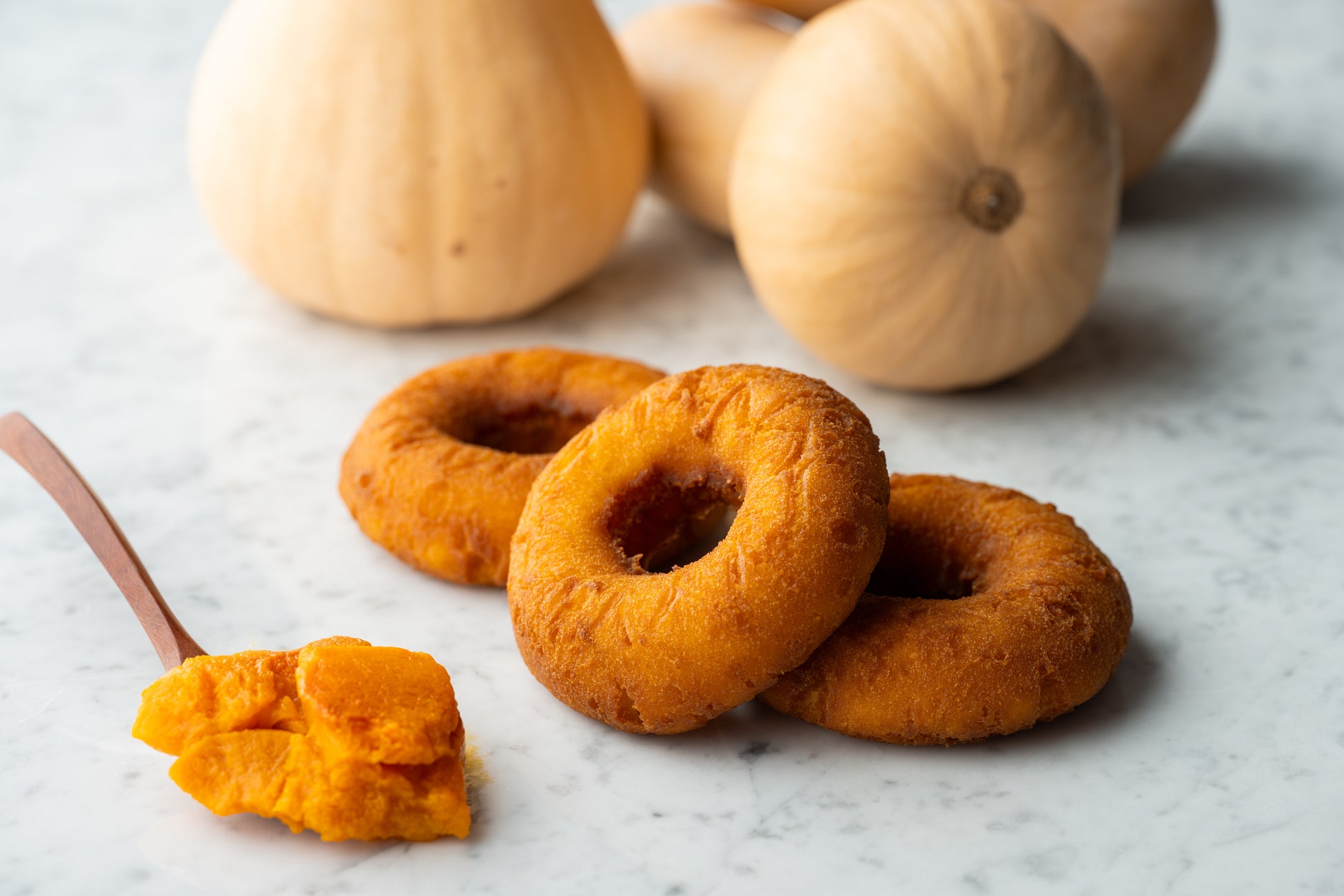 バターナッツかぼちゃは、鮮やかなオレンジ色で水分が多く柔らかい果肉が特徴です。その色味を活かし、しっかりとしたかぼちゃの風味を感じられるドーナツに仕上げるため、オーブンで1時間ほどじっくりと焼いて水分を飛ばしてから、ドーナツ生地に30%以上練り込んでいます。