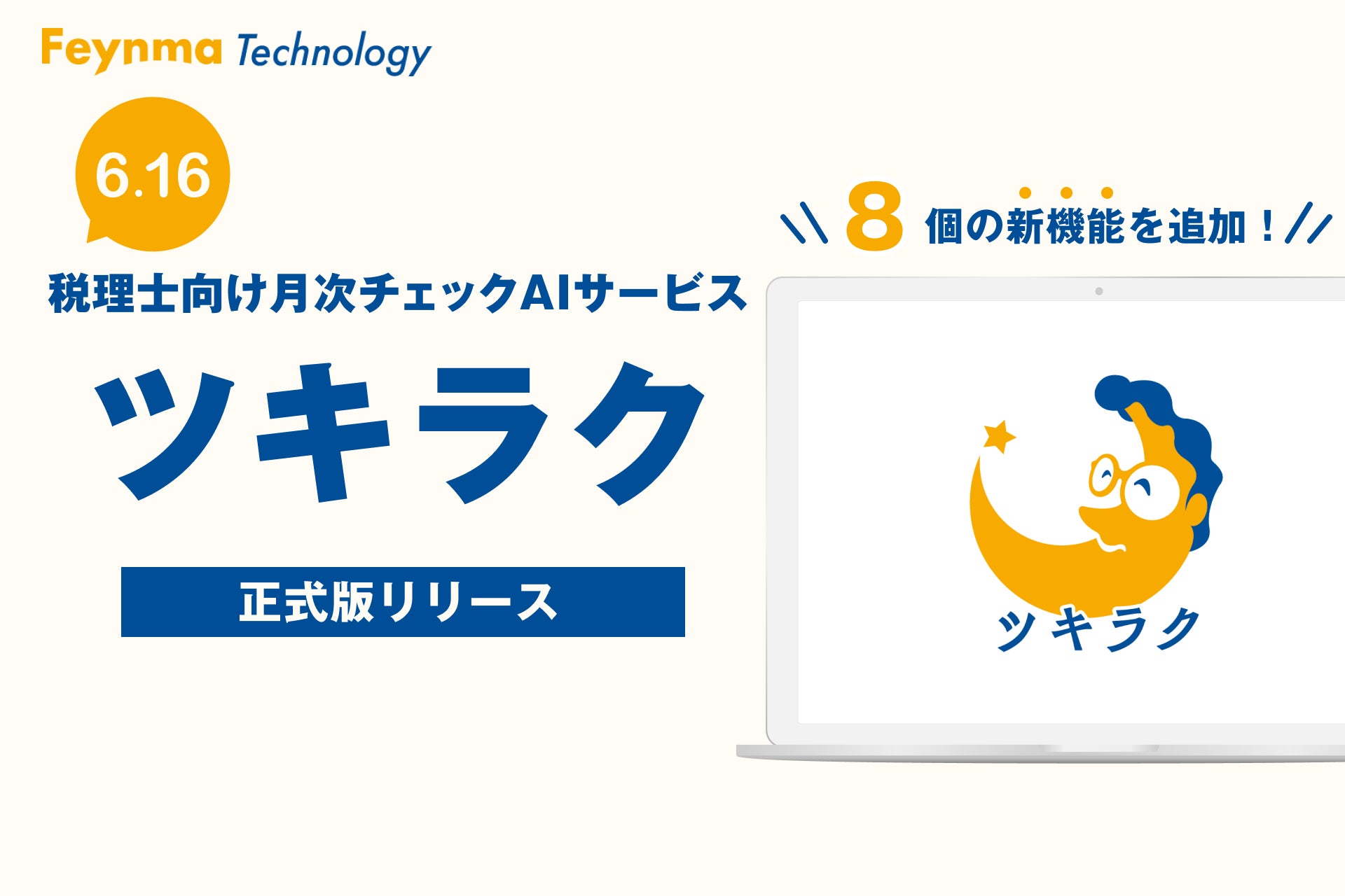 株式会社Feynma Technology(本社:名古屋市東区、代表取締役:土屋太助)が提供する、税理士向け月次チェックAI「ツキラク」は、2025年6月16日(月)より正式版サービスの提供を開始いたします。本サービスは、税理士向けのAIを活用した業務効率化サービスです。これまで多くのお客様にご利用いただいた無償トライアル期間を通じて蓄積したフィードバックをもとに、品質向上と機能強化を図ってまいりました。今後は、より安定的かつ高品質なサービス提供を目指し、正式版として本格的な提供を開始いたします。